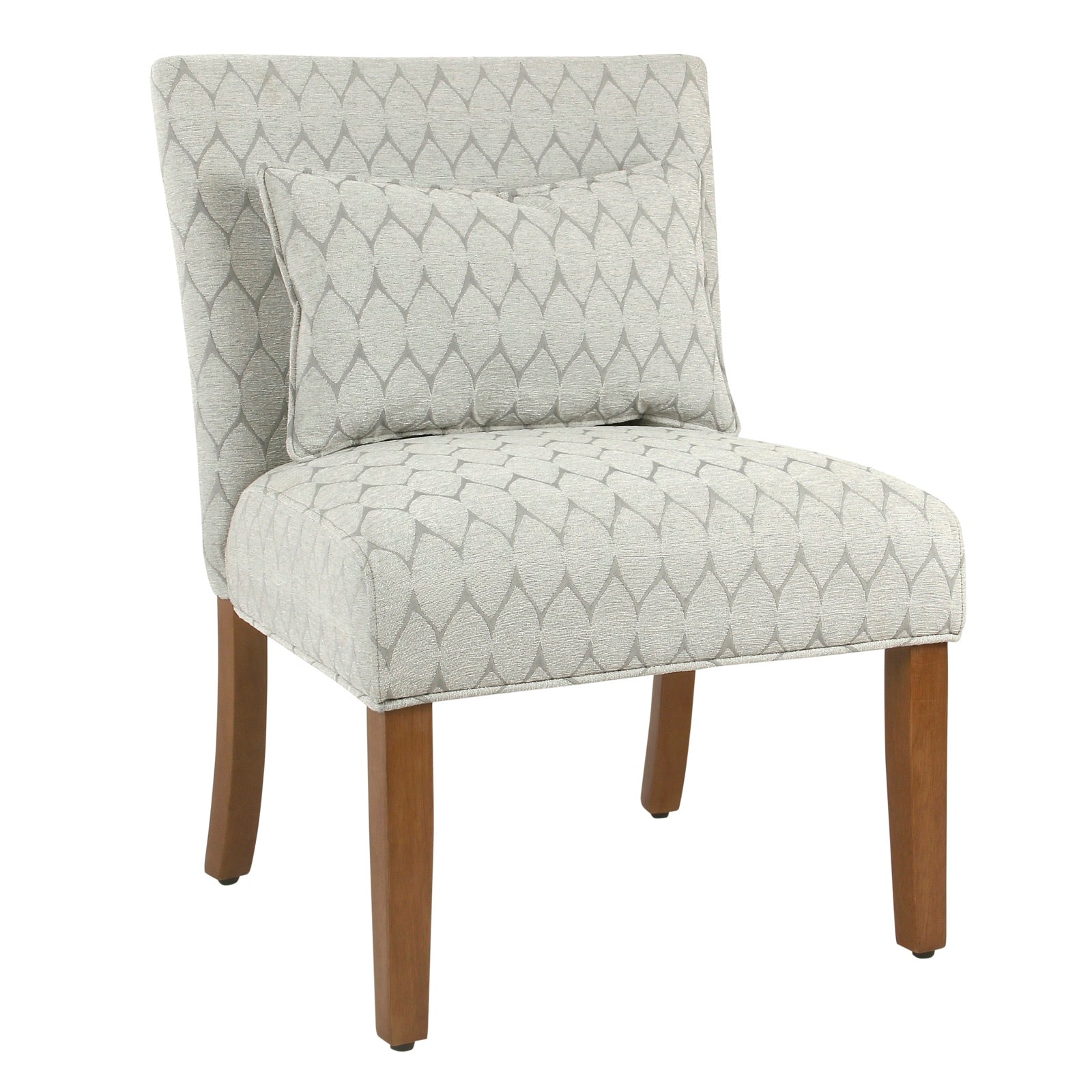 Lend a pop of pattern to your seating ensemble or accent the master suite in artful fashion with this stylish Accent Chair. Founded atop four brown finished wooden legs, the frame of this chair is upholstered in gray fabric and it features a striking modern geometric pattern for added visual interest. The cushioned seat and backrest of this chair provides user a comfortable place to sit, while a toss pillow in matching upholstery completes its look. Add this chair into your living room, bedroom or common space and bring style to your home Decor.