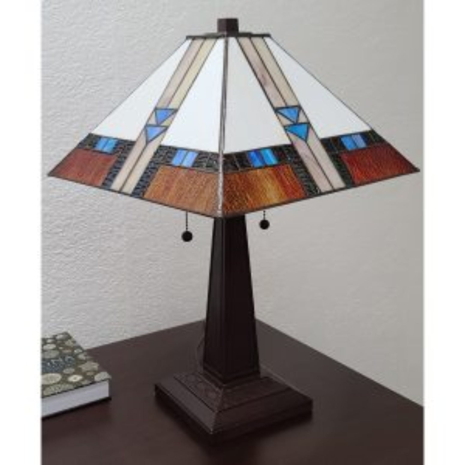 A warm glow spills from under a geometric work of art in this Tiffany style table lamp. Give your interior decor a unique accent with a design that never goes out of fashion. Handcrafted using the same techniques that were developed by Louis Comfort Tiffany in the early 1900s, this beautiful Tiffany-style piece contains hand-cut pieces of stained glass, each wrapped in fine copper foil