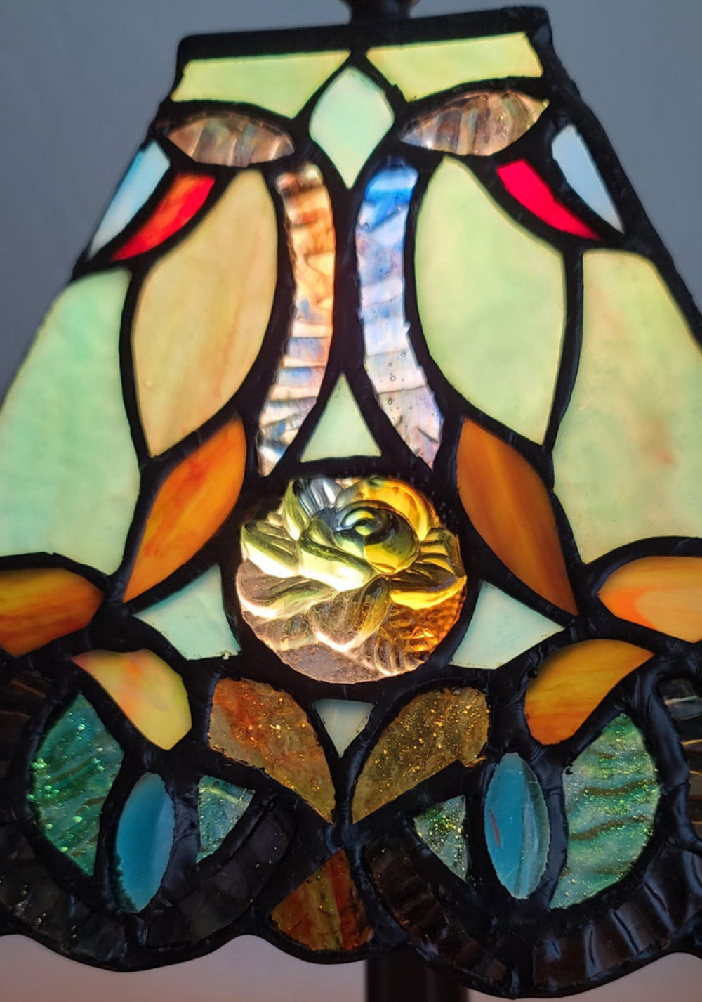 This Tiffany style lamp is hand-crafted using the same techniques that were developed by Louis Comfort Tiffany in the early 20th century. Each piece of glass is hand cut to the perfect shape and size, wrapped in copper foil, and soldered together to create a truly unique piece of art.