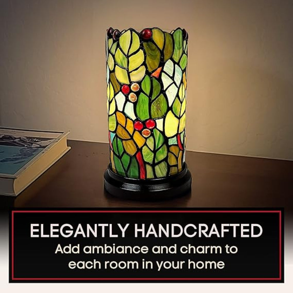 10.5 inch Tiffany lamp,Amora accent table lamp,Amora Lighting,Amora Lighting mini lamp,berries motif table lamp,handcrafted stained glass lamp,Leaves & Berries Accent Table Lamp,nature-inspired accent light,rustic mini lamp,stained glass leaves lamp,Table Lamps,Tiffany mini lamp,traditional small table lamp