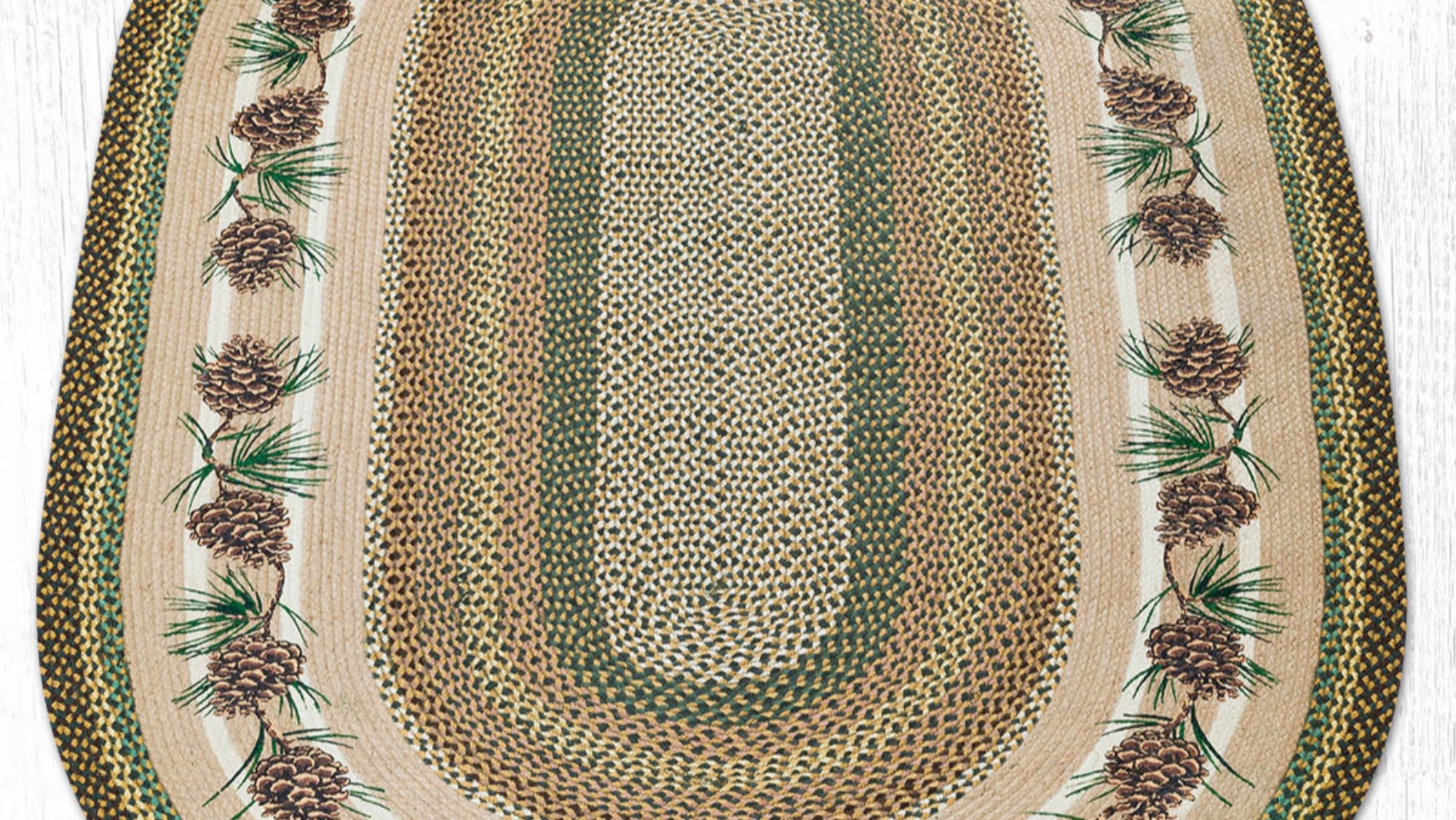 $100 – $200,cabin entryway rug,cabin style jute rug,decorative oval rug,Earth Rugs,Earth Rugs rustic rug,eco-friendly jute oval patch,farmhouse oval floor rug,hand-braided forest rug,lodge cabin décor,lodge farmhouse décor,natural fiber jute rug,Needles & Cones rug,oval farmhouse accent,pine needles and cones rug,Placemat,rustic living room rug,rustic lodge oval patch,Uber Living