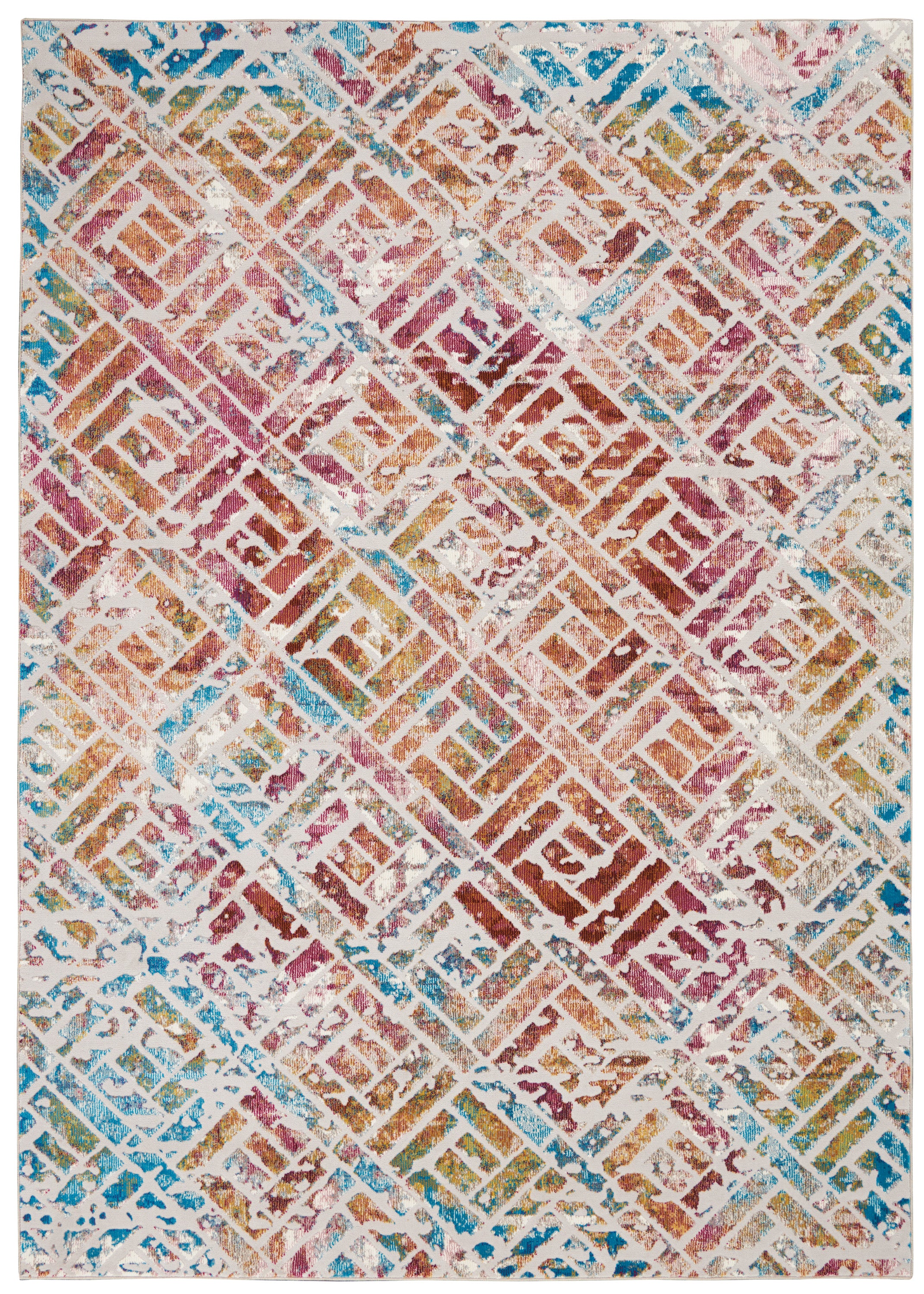 The dynamic geometric tile design of this colorful rug from the Entice Collection is lovingly distressed and enlivened with blended shades of red, turquoise blue, and gold, creating an aura of splendor and excitement. Easy-care low-pile fibers with carved detailing bring superb texture and wear anywhere in your home.