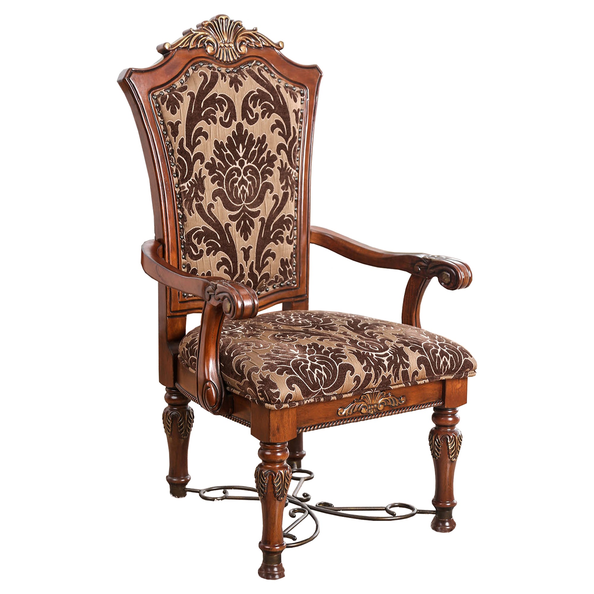 This traditional Style wooden arm chair surely impress your guest. It features intricate wood carvings, floral print fabric upholstered padded seat and back, Scrolled armrests, turned legs and scrolled metal accents on base. It will be perfect addition of style with comfort to make your guests want to return again and again. Made up of wood and features padded pattern fabric seat and back with brown finish. It includes set of 2 arm chairs.