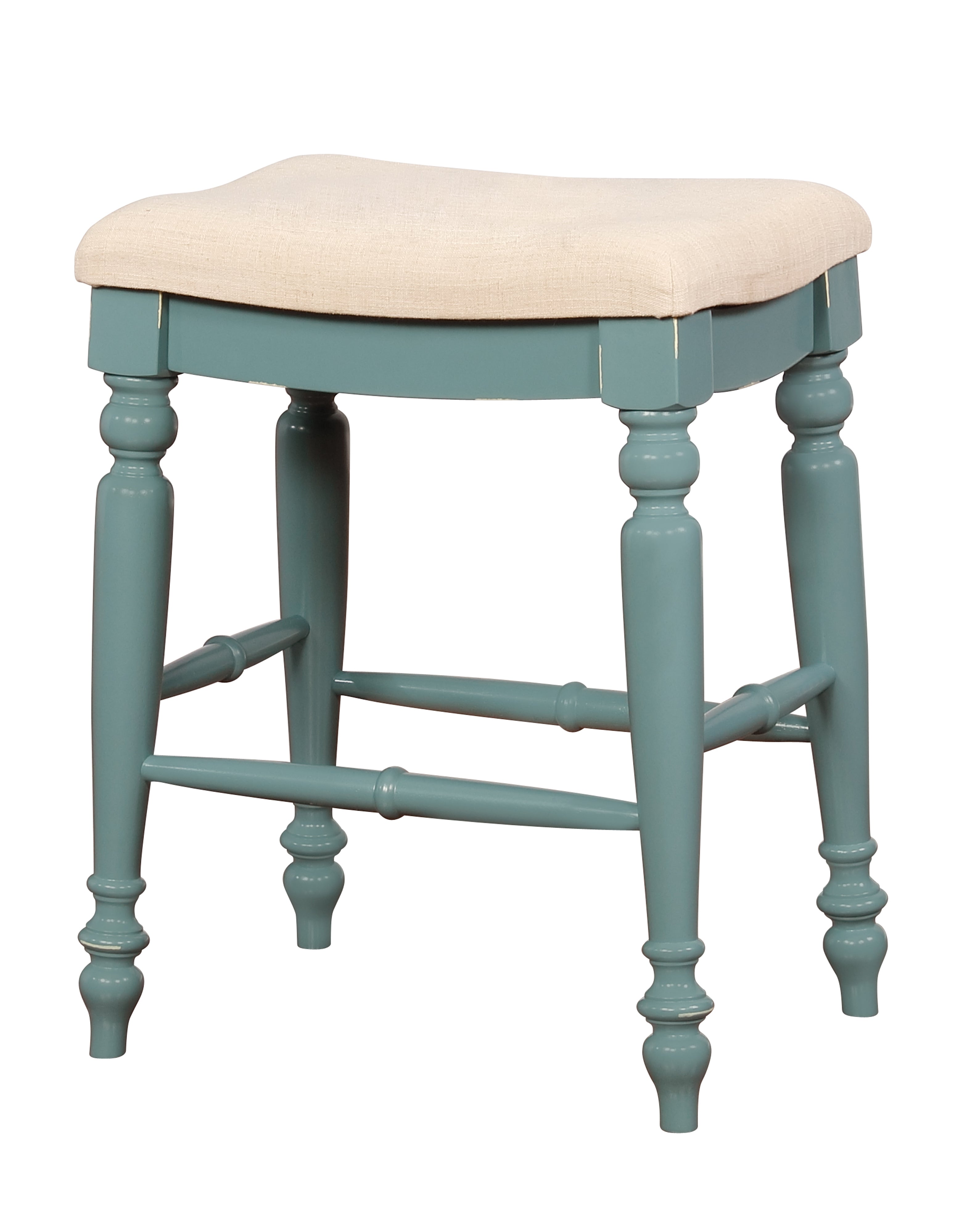 Update your home Decor with the addition of this counter stool which features a saddle seat with turned legs with footrest support for enhanced stability. It is made with a combination of solid wood and rubberwood in a teal blue finish with foam cushioned, beige fabric upholstered seat. It will be a great addition to your home and will find a perfect place alongside your kitchen island or bar counter.