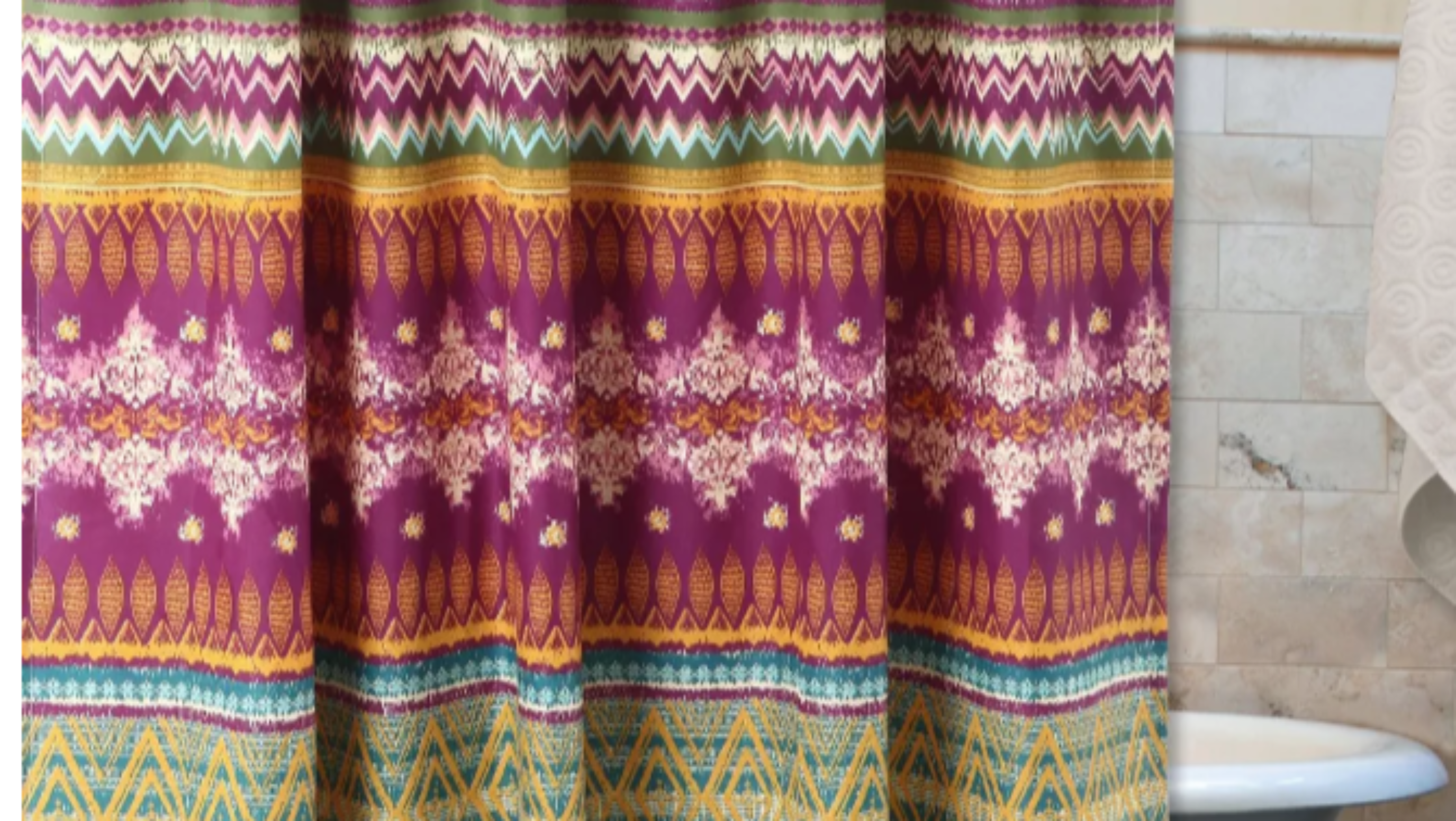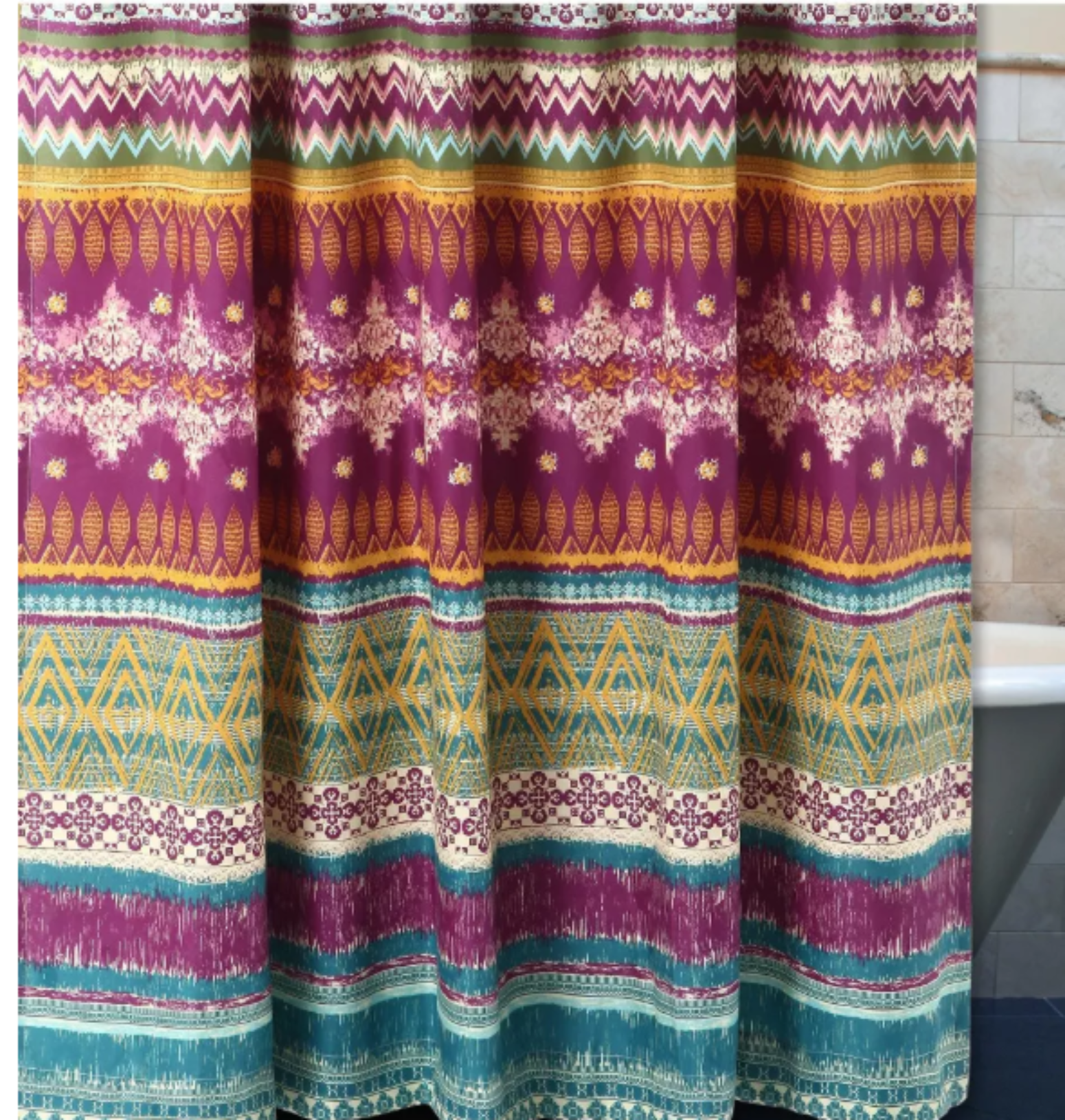 Bring the spirit and style of the Great Southwest to your home with the Southwest shower curtain. Deep, saturated fuchsia, gold and spruce tones contrast with vivid pink and robin’s egg blue in motifs. Dimensions: 72x72``. Machine washable. Whether paired with rustic accents or boho-chic details, this curtain offers a vibrant focal point in any bath space.