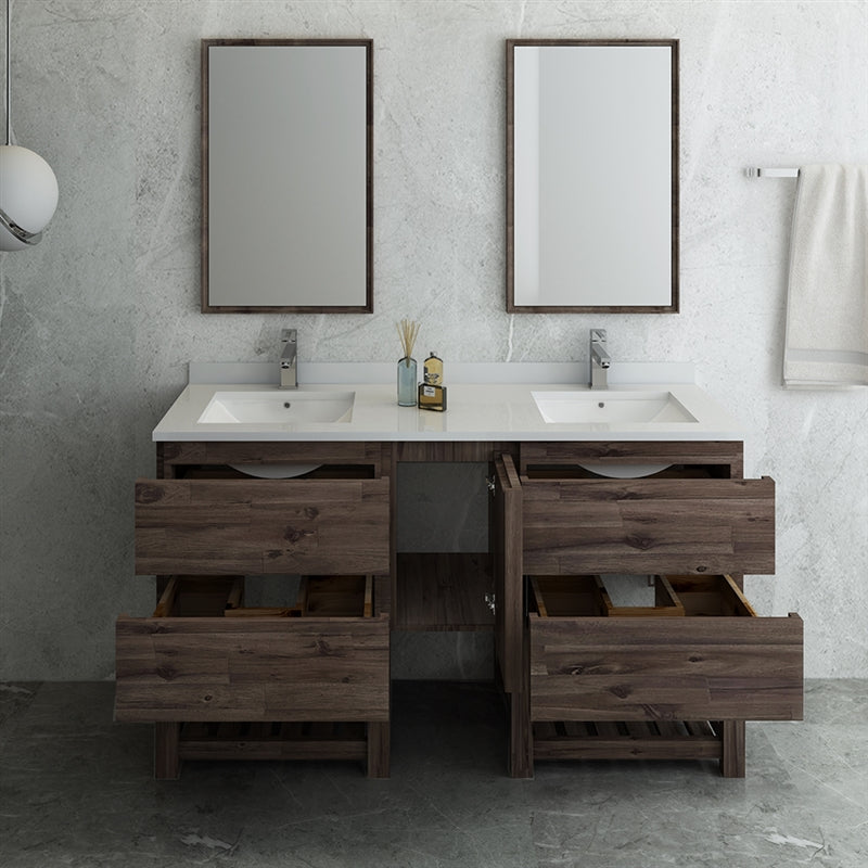 The Fresca Formosa Double Sink Slat Bottom Open Shelf Bathroom Vanity is superbly crafted of solid Acacia wood, known for its magnificent beauty and durability. It has a warm grey finish with a hint of brown throughout, and a natural grain that will inject luxurious warmth into any space. A masterpiece of elegance and style, this wall-mounted vanity measures 60” in width. With solid wood, soft-closing dovetail drawers and a roomy center cabinet that’s perfect for shampoo bottles, towels or other essentials, this bathroom vanity features tons of storage. The solid pine drawers are clear coated and feature a mitered, wrap-around design that adds to the superior detailing. Cove routed pulls are carved directly into the drawers and cabinet door, keeping the design sharp and sophisticated. This handsome vanity also has slatted shelving on the bottom, creating an open and airy spa-like feel. Gracing the top of the vanity is a stunning 60” quartz stone countertop and two ceramic undermount basins. The white ceramic basins are equipped with an overflow and the countertop has been pre-drilled to accommodate the faucet of your choice. P-trap, pop-up drain and installation hardware are included. This Formosa Double Sink Wall Mount Bathroom Vanity comes with two matching 20” Acacia Mirrors with frames that are cove routed and mitered, providing the perfect finishing touch