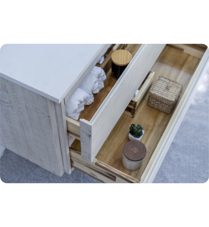 • Materials: Solid Acacia Wood Construction, Quartz Stone Countertop, Ceramic Undermount Sinks w/ Overflow