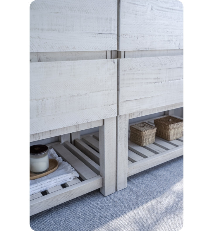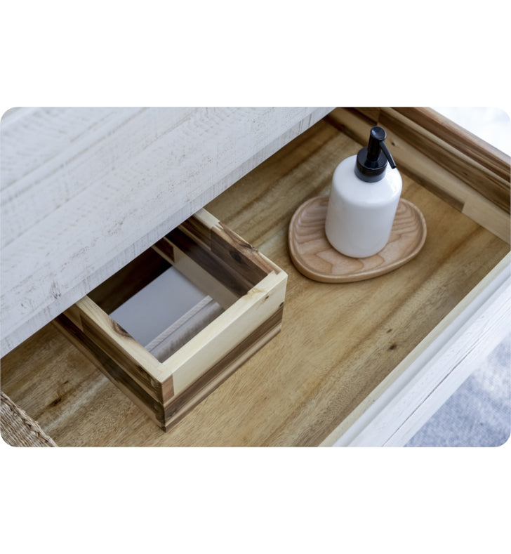 • Materials: Solid Acacia Wood Construction, Quartz Stone Countertop, Ceramic Undermount Sinks w/ Overflow