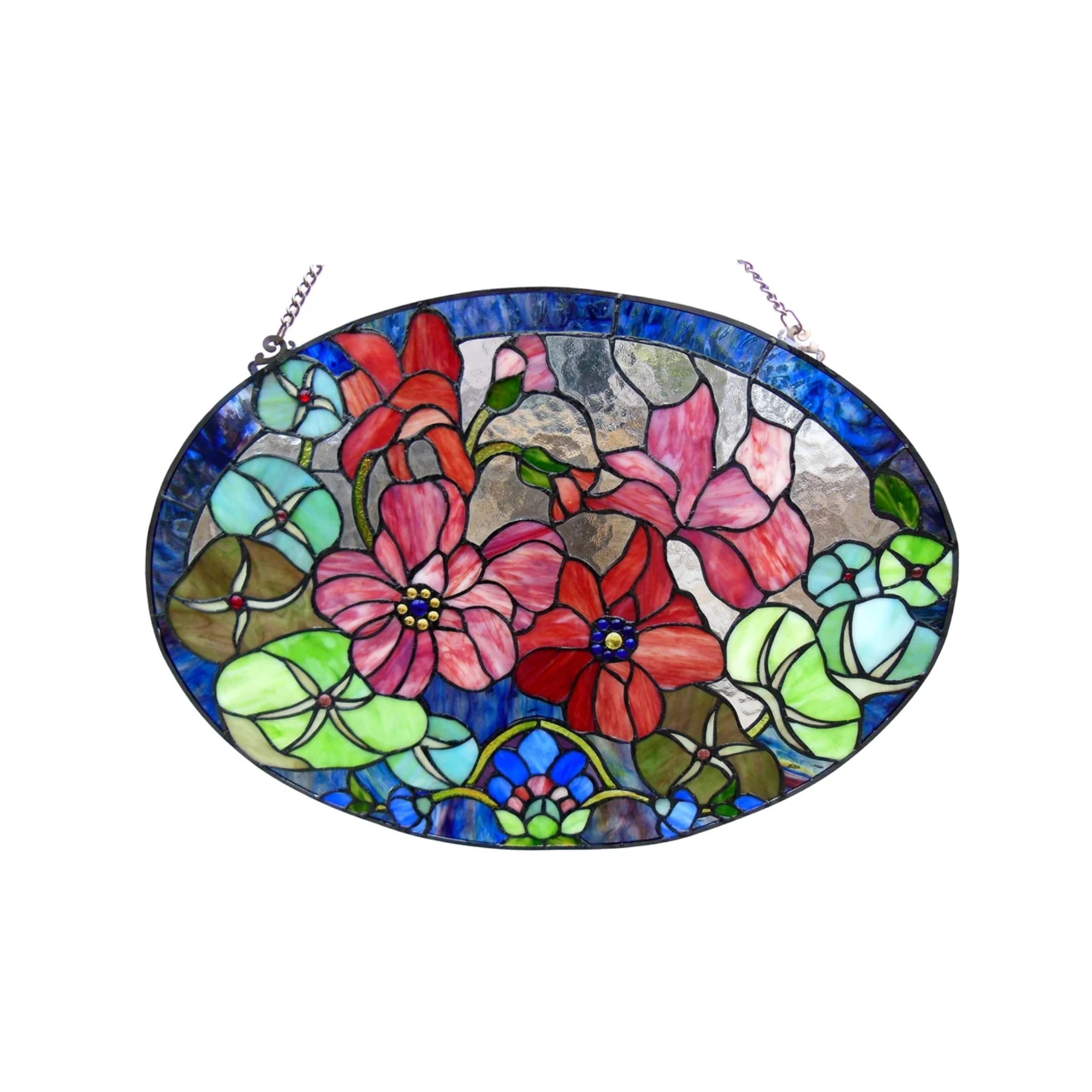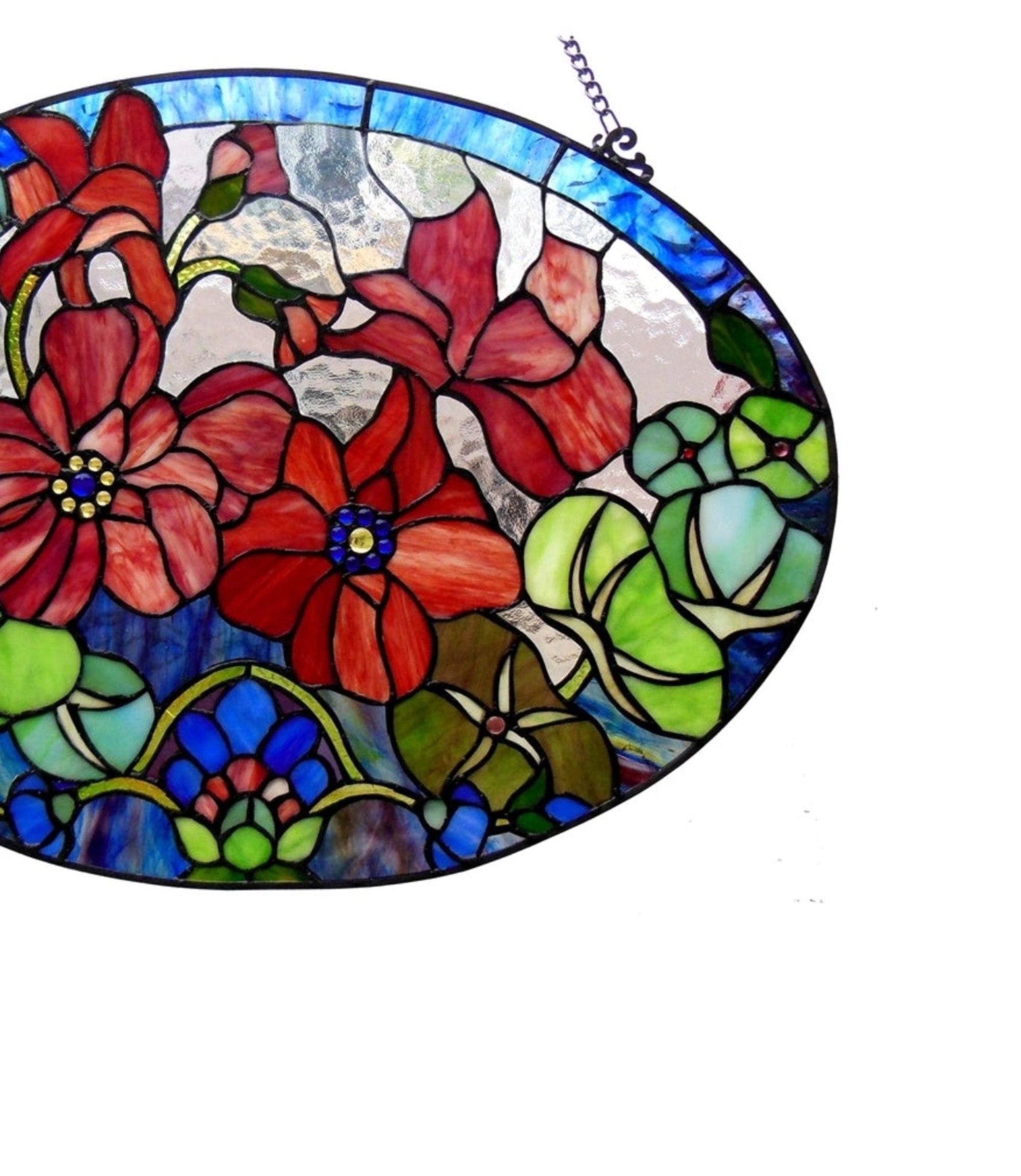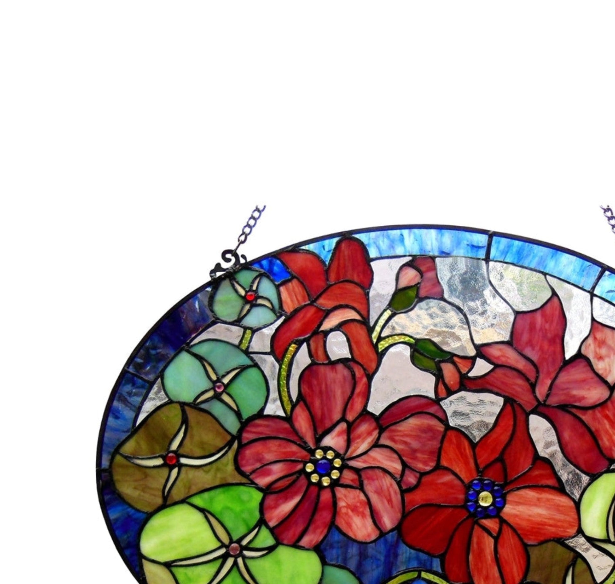 CHAMBER is a radiant floral-themed Tiffany-style window panel that infuses natural light with vivid hues of red, green, and blue. Crafted by hand using 273 individually cut pieces of stained glass and 24 decorative beads, this oval window accent brings timeless beauty to your favorite indoor space. The antique brass-toned frame enhances its vintage appeal, while the included hooks and 27.5" chain make installation effortless.