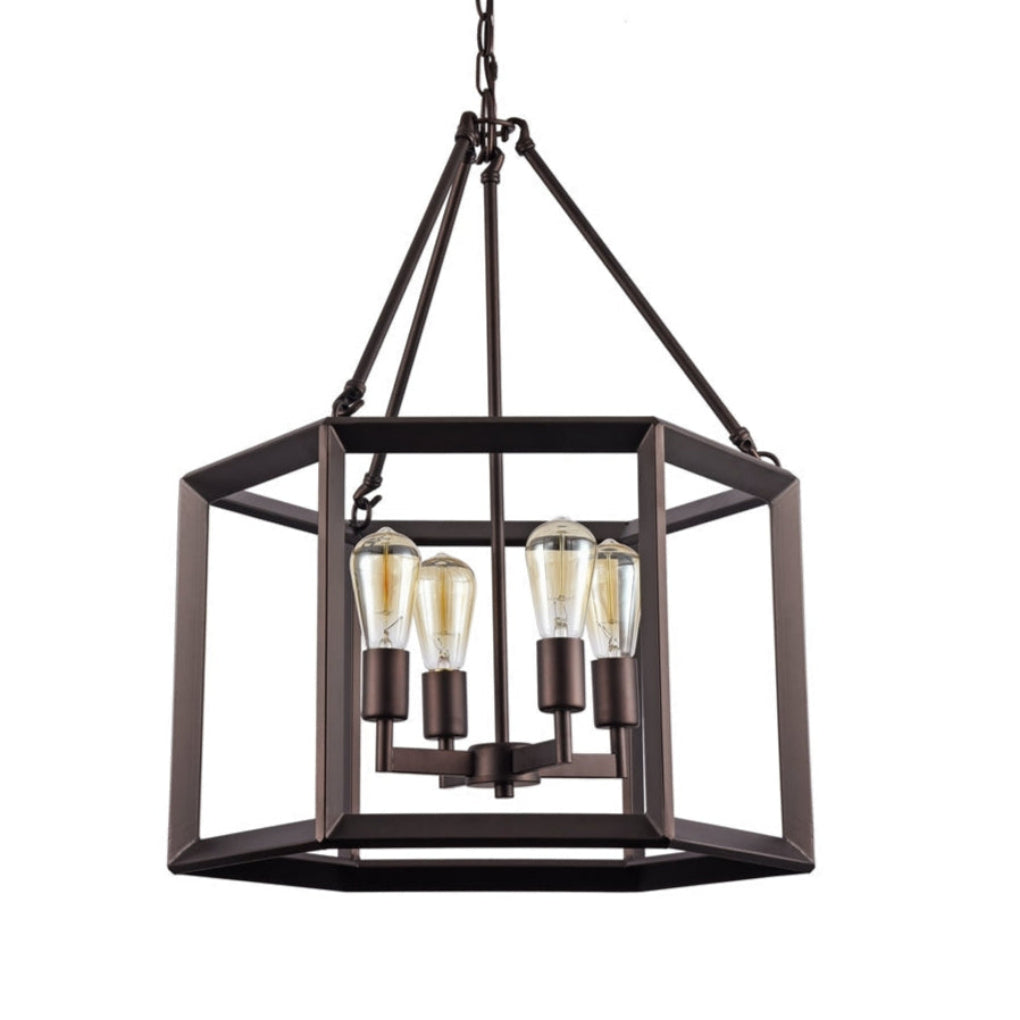 The Chloe Lighting CH59058RB21-UP4 "Ironclad" Industrial-Style 4-Light Rubbed Bronze Ceiling Pendant features a geometric, open-frame design with a hexagonal steel frame finished in oil-rubbed bronze. This fixture is ideal for enhancing industrial, urban, loft, or transitional interiors.