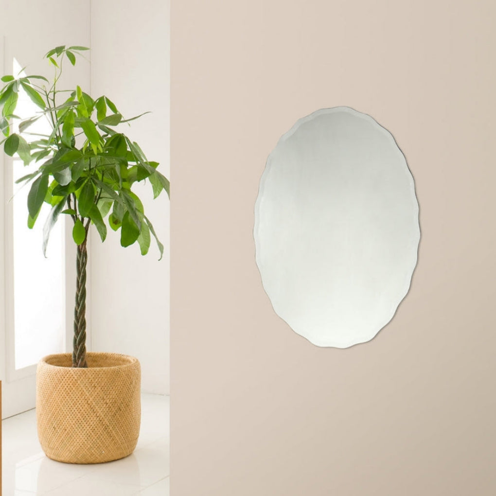 The Chloe Lighting CH7M049SV24-GOV Myrlin Large Frameless Wall Mirror is a contemporary oval mirror featuring a beveled edge. It measures approximately 23.62 inches in width and 31.5 inches in height, with a glass thickness of 0.2 inches. The mirror is frameless, offering a sleek and modern look suitable for various home decors.