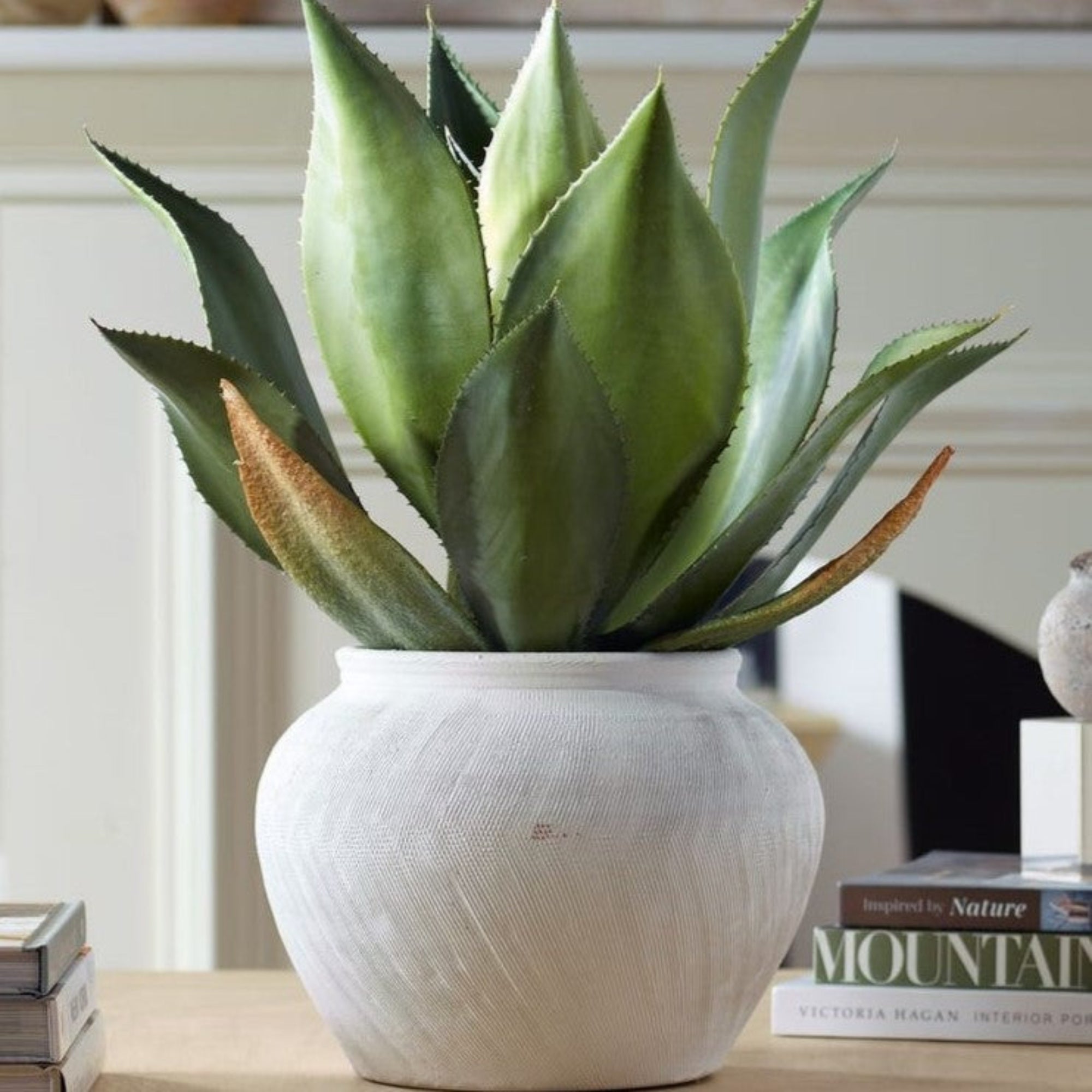 SKU - UT60235Tierra Botanical Centerpiece with Lifelike Green Agave in Organic Textured Off-White Sculptural Vase