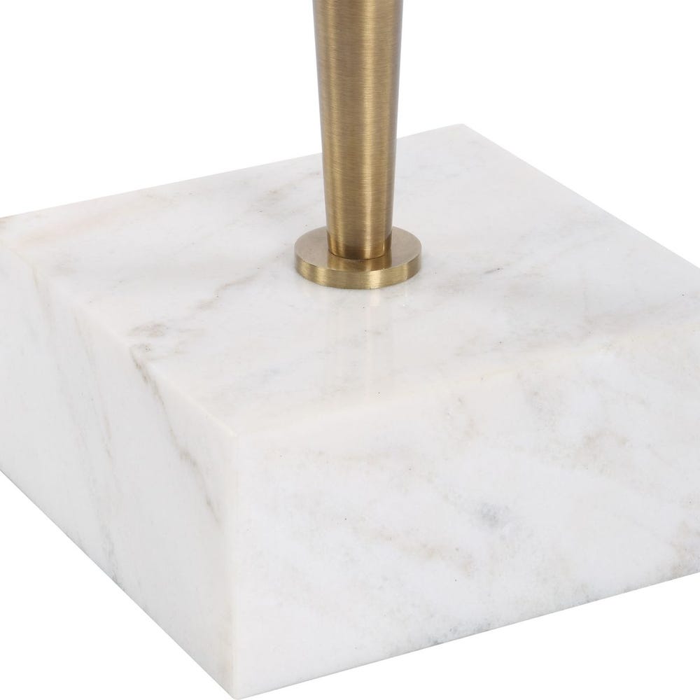 Striking the perfect balance between glamour and minimalism, the Uttermost Campeiro Brass Drink Table elevates any room with luxurious materials and refined design. Created by designer Matthew Williams, this 29-inch tall accent table showcases a thick crystal top, perched on a sleek tapered stainless steel base plated in brushed brass. The sculptural silhouette is grounded by a solid natural white marble foot, adding visual weight and elegance. Compact at 12.75" W x 12.75" D, it’s ideal for placing beside a chair or sofa, offering a chic surface for cocktails, décor, or personal items. Crafted in China, this table is a sophisticated accent for luxe interiors.