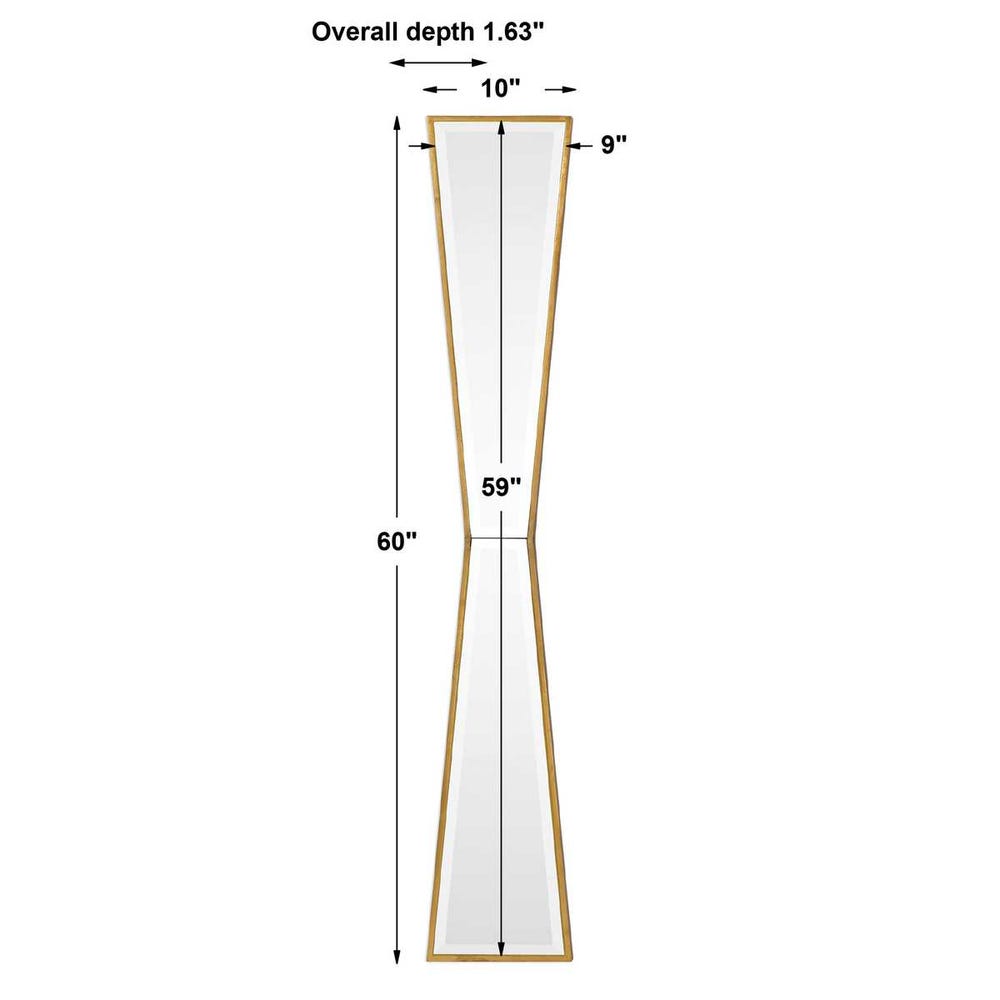 The Uttermost Corbata Gold Mirror is a stunning bowtie-shaped wall mirror that effortlessly blends elegant design with functional decor. Crafted from premium MDF and mirror glass, this piece features a solid wood frame hand-finished in a delicately antiqued gold leaf for a luxurious shimmer. Measuring 60 inches in height and 10 inches in width, the beveled glass surface can be displayed either vertically or horizontally, making it versatile for any room setting. Ideal for adding a sophisticated touch to living rooms, hallways, or bedrooms, this mirror elevates your space with its unique silhouette and timeless style.