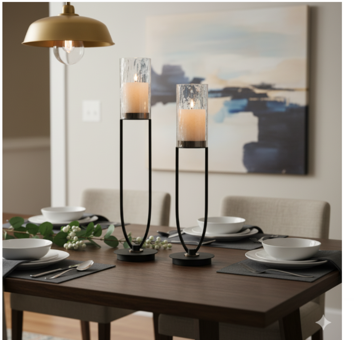 black iron candle stand,bronze accent candleholders,Candle Stands & Holders,candleholders set,designer candle holder set,floor candleholders,industrial chic decor,iron and glass candleholders,matte black candleholders,Matthew Williams home accessories,tall candle holders,Uttermost Durga collection,water glass globe decor