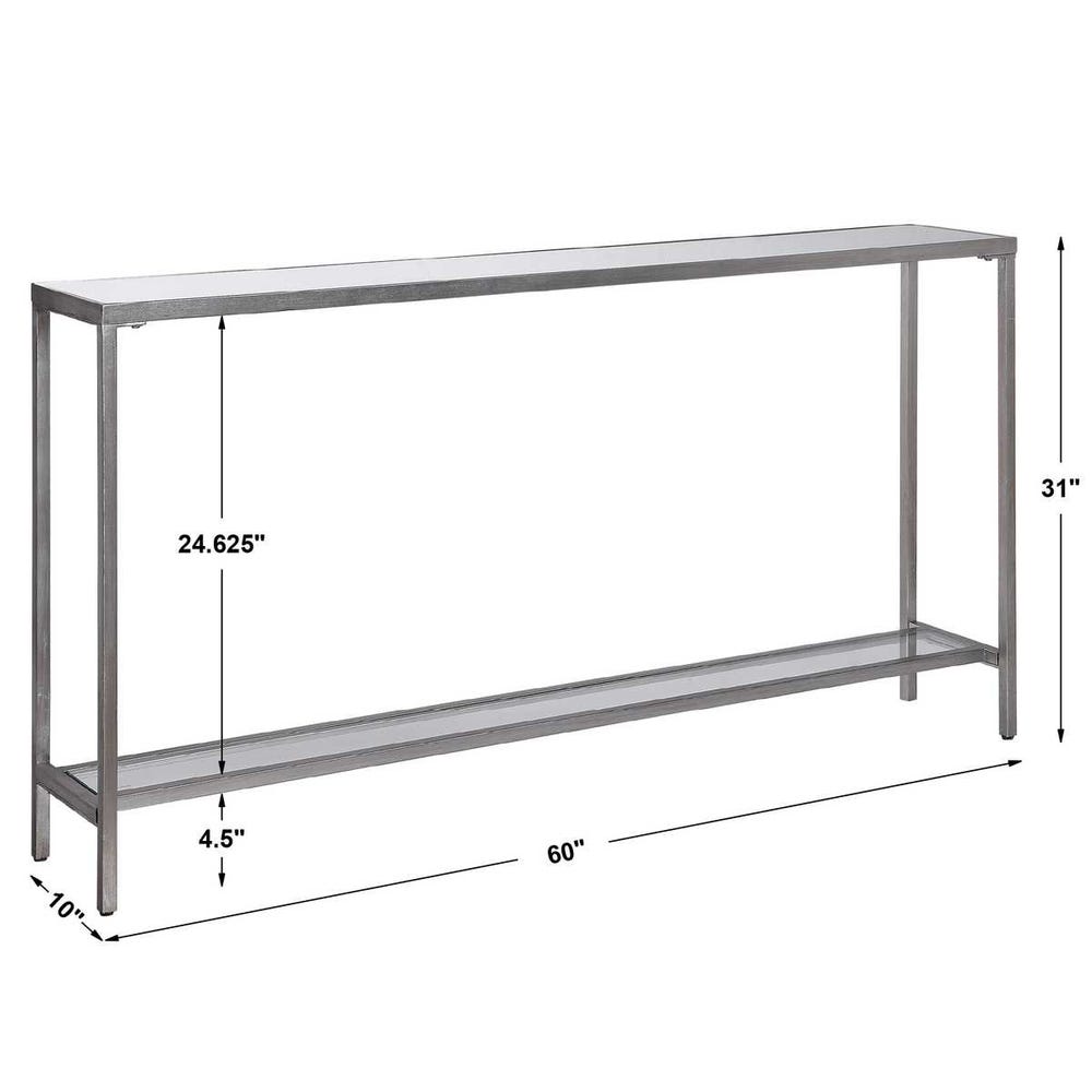 Refined elegance meets modern minimalism in the Uttermost Hayley Silver Console Table, a sleek statement piece designed by Grace Feyock. This narrow console features a hand-forged iron frame finished in lightly antiqued silver leaf, offering a subtle shimmer without overwhelming the space. The inset beveled mirror top adds visual depth, while a clear glass gallery shelf provides extra surface space for curated decor. At 31"H x 60"W x 10"D, it’s the perfect slender silhouette for hallways, entryways, or behind sofas, offering both beauty and function without bulk. Crafted in China with premium materials for long-lasting appeal.