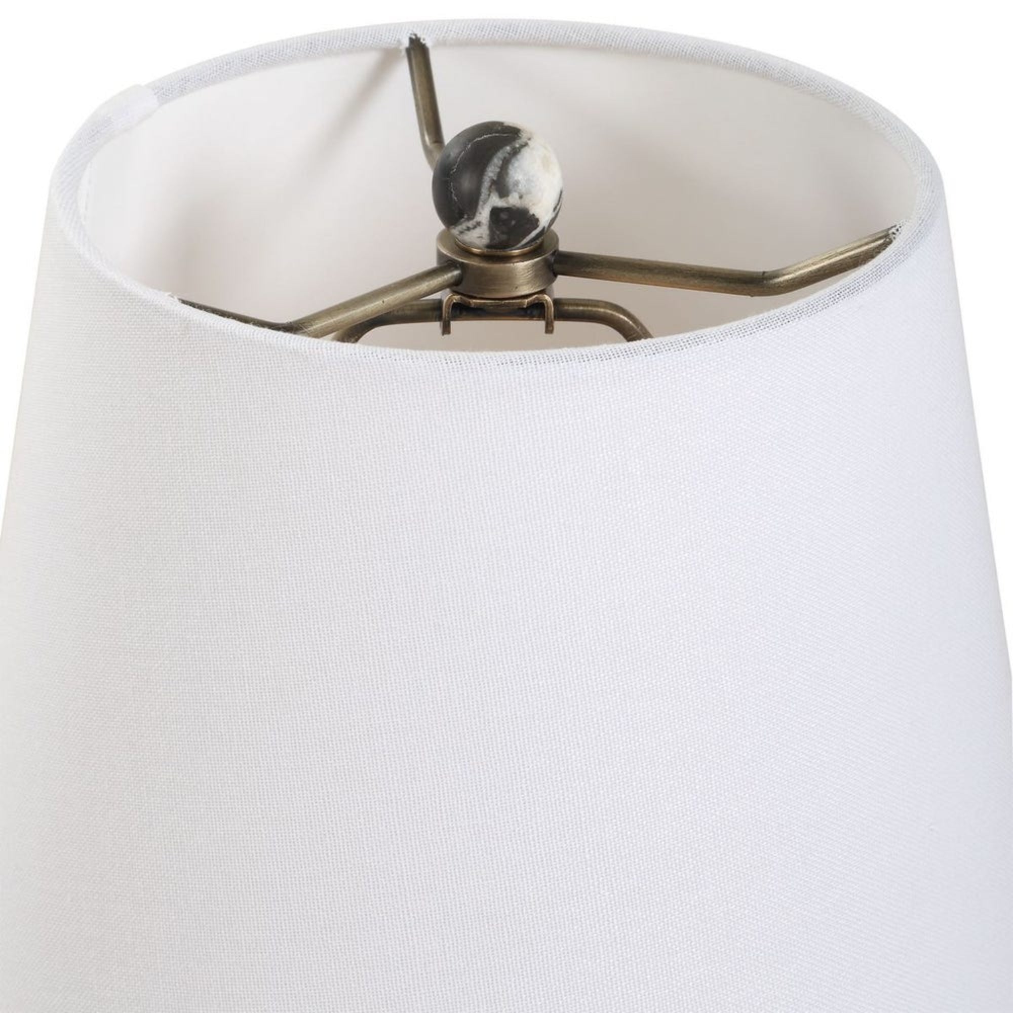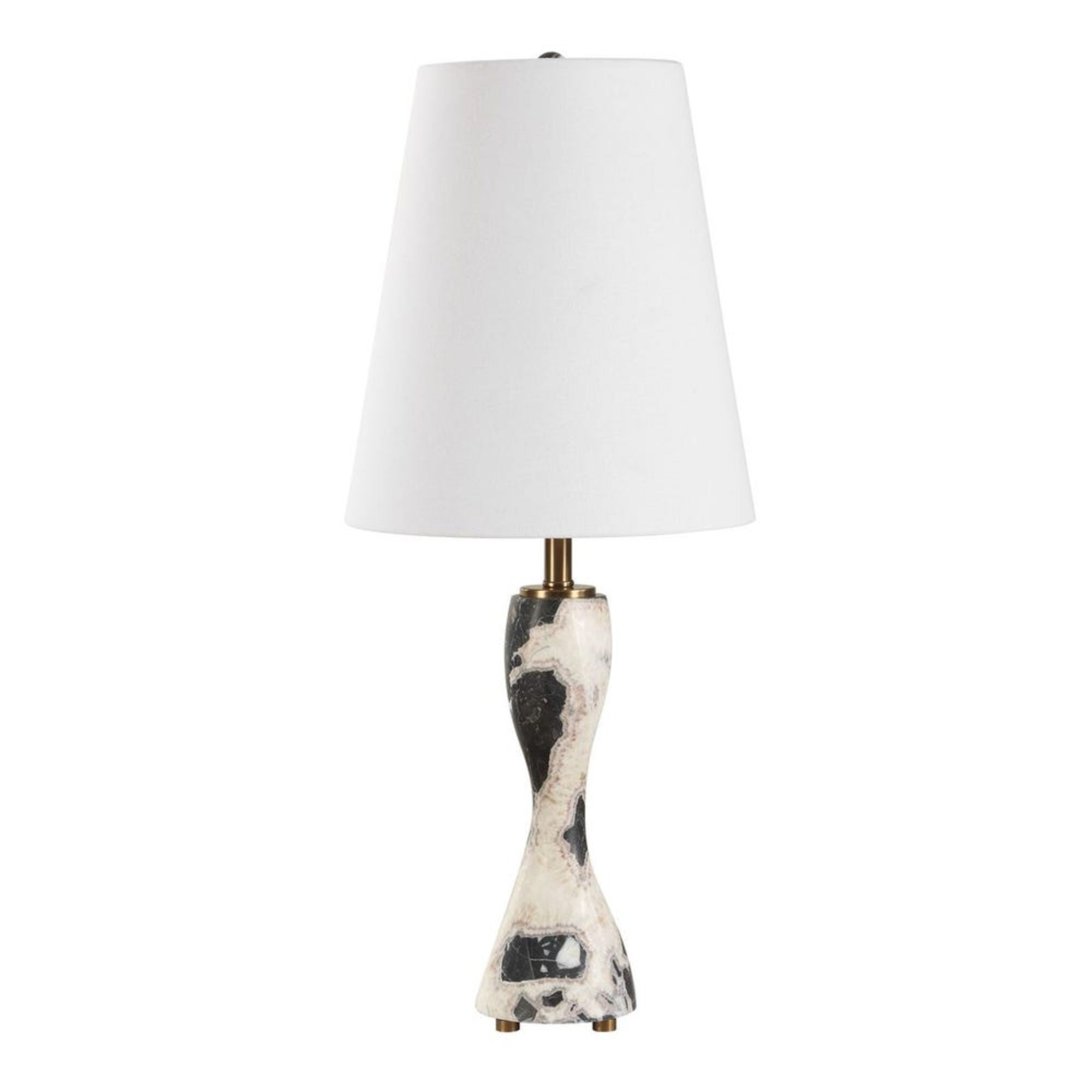 SKU - UT30598-1Marcela Panda Marble Buffet Lamp – 25.375"H Hourglass Base with Brass Accents & White Linen Shade