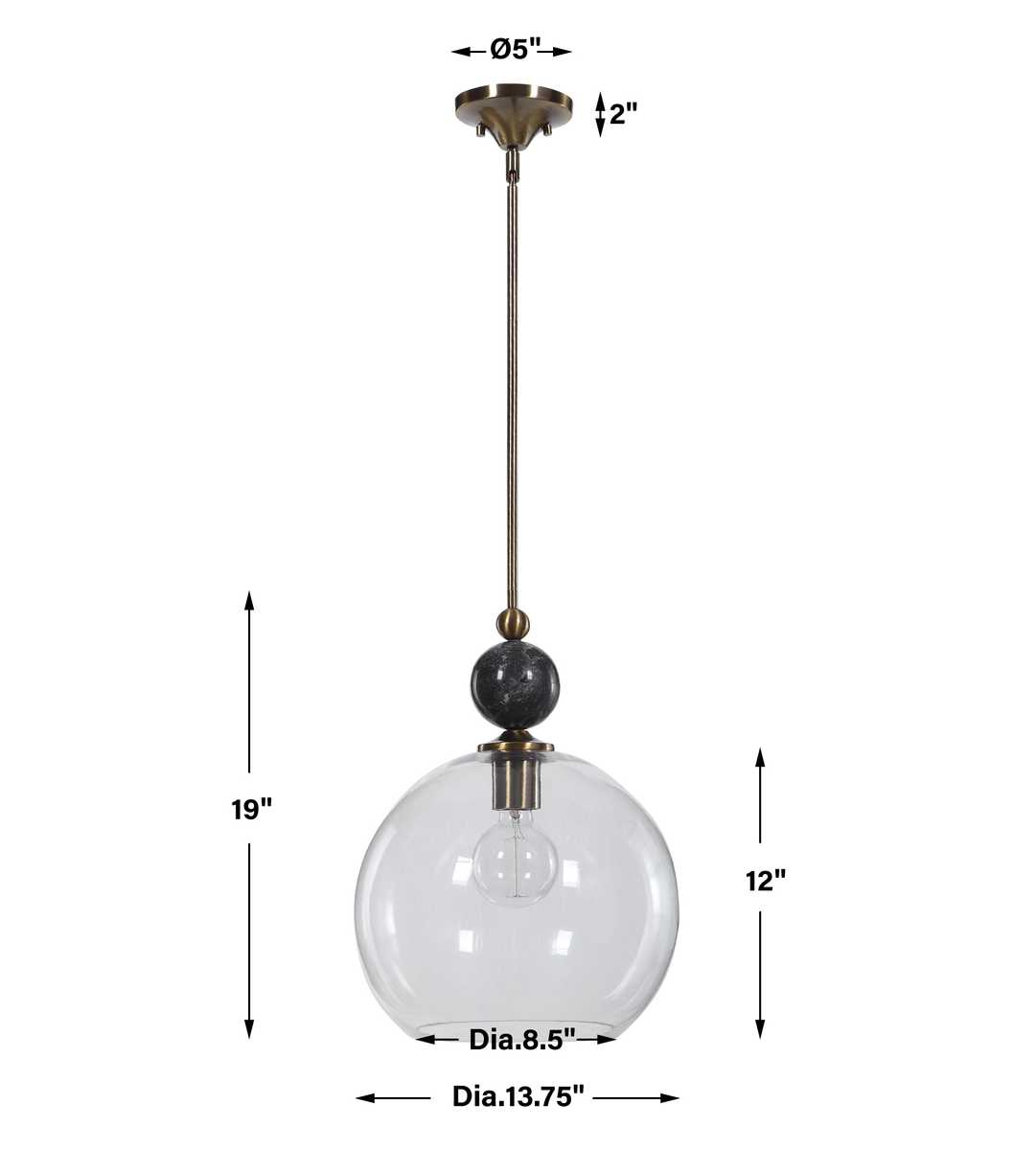 The Uttermost Mendota 1 Light Pendant combines elegance and modern charm in a single fixture. Its clear 13" diameter glass globe is paired with an oxidized aged brass metal finish and a rich black marble accent, creating a timeless look.
