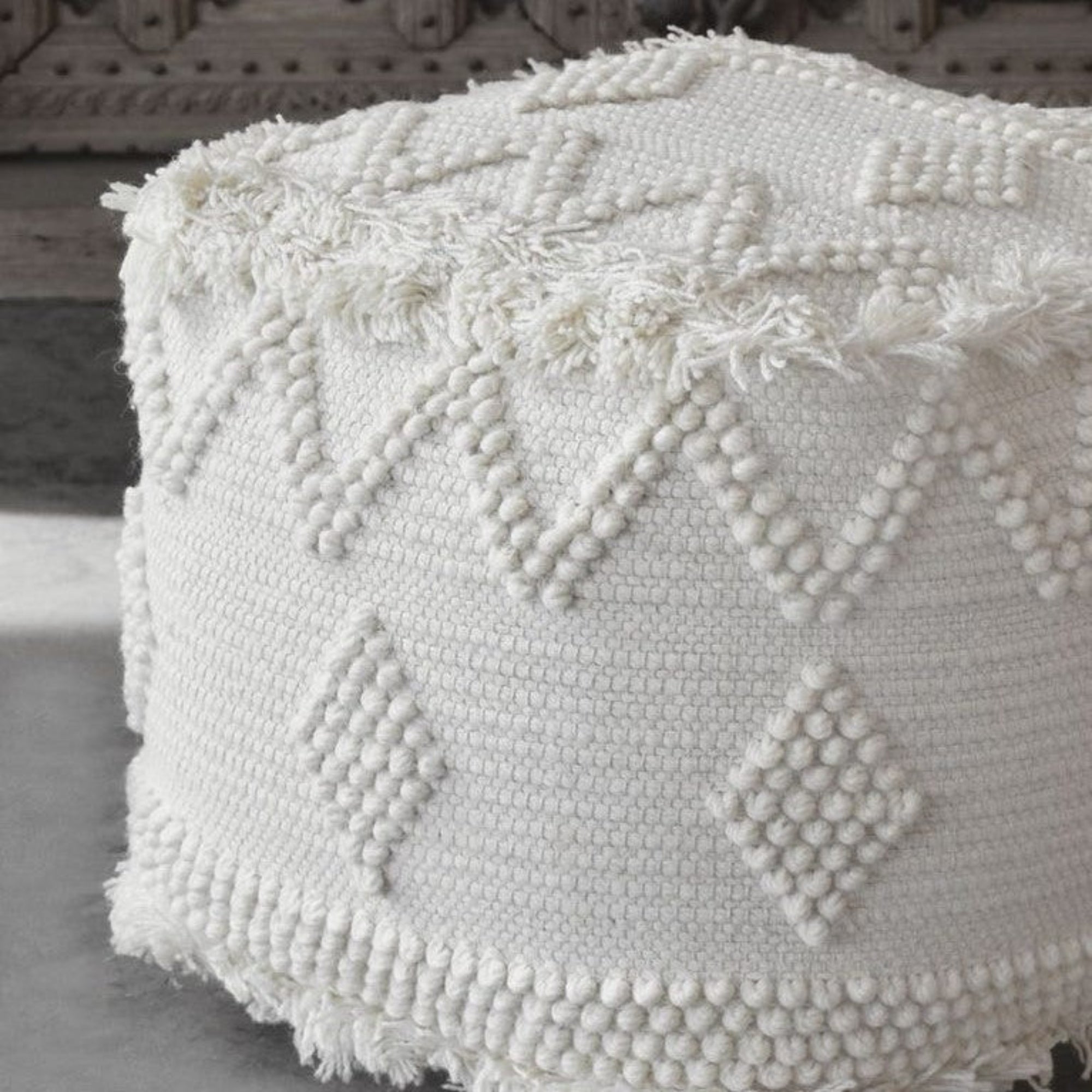 SKU - UT23965Uriah Ivory Bohemian Pouf – Handwoven Wool & Cotton Cube with Raised Patterns and Fringe