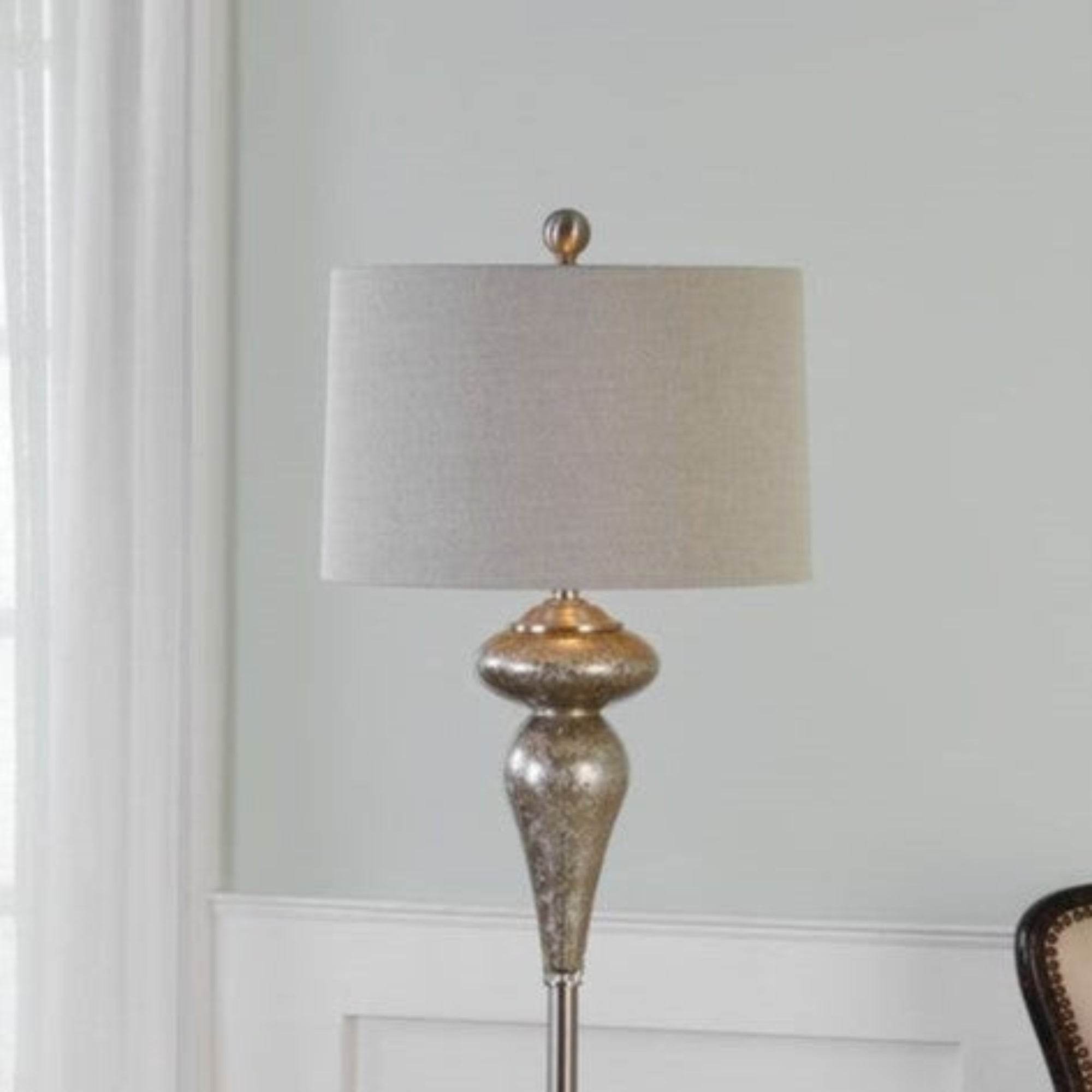 SKU - UT28102-2Vercana Mercury Glass and Brushed Nickel Floor Lamp with Beige Linen Shade – 64” Tall, 3-Way Socket – Individually Priced