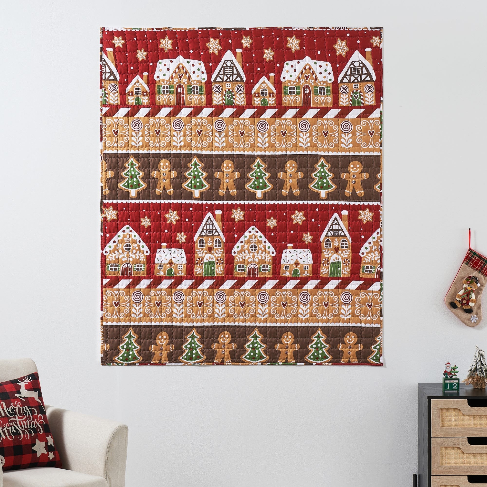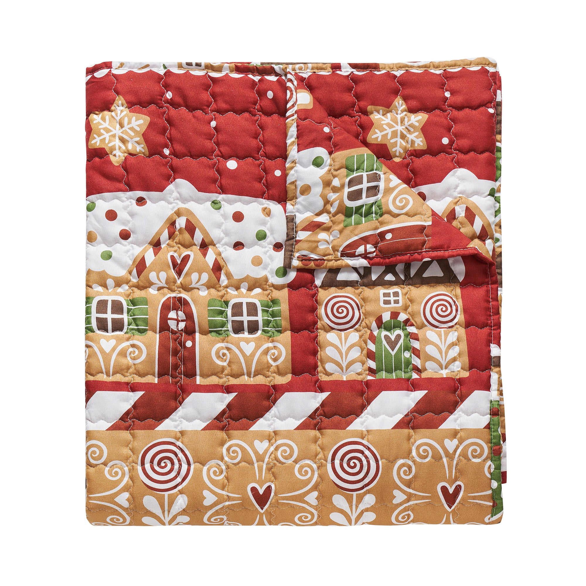 Bring warm holiday charm to your home with the Gingerbread Lane Throw by Greenland Home Fashions. Measuring 50" x 60" (+/- 2"), this cozy throw is perfect for draping over a sofa, loveseat, or bed, and can even be displayed as a festive wall hanging. The brushed microfiber shell showcases a charming seasonal design, while the reverse features a coordinating fashion print for two looks in one. Filled with soft 100% polyester, this throw provides lightweight warmth and a plush feel, making it an ideal accessory for holiday decorating or everyday comfort.