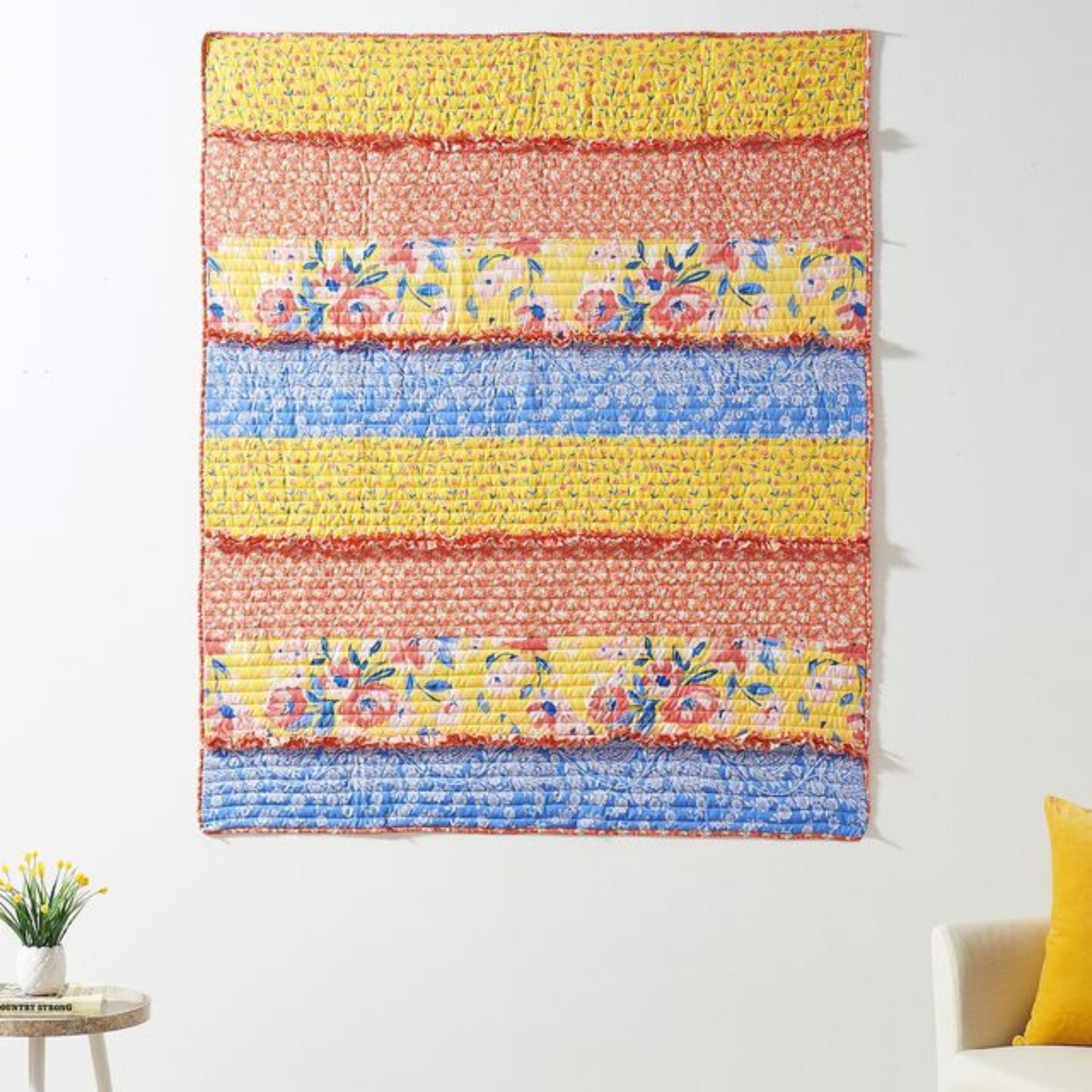 The Skylar ruffled throw quilt adds vintage bohemian styling with warm, bright colors. This throw blanket features rows of ruffles, adding unique character and surface interest. Reverses to an all-over calico print in white, yellow and papaya. Prewashed with extra softener for a silky feel. Machine quilted with fabric bound edges for durability and surface interest. Dimensions: Throw measures approximately 50 x 60 inches. Dimensions +/- 2 inches. Machine Wash. 100% Microfiber polyester shell with 100% polyester fill. Imported.