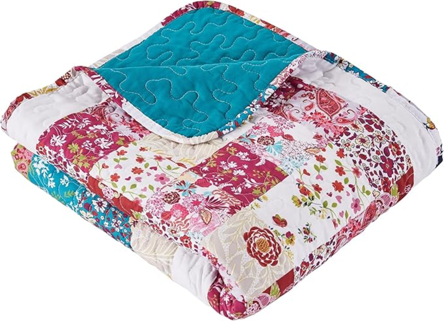 Update your traditional home decor with the Harmony quilted throw blanket. Printed in a time-honored nine square patchwork motif featuring gold, teal blue, red and green colors, the Harmony quilt will brighten your mood and make every day feel like a holiday! Classic, contemporary patterns and a solid color teal reverse complete the look. Dimensions: 50x60`` (+/- 2``). 100% microfiber shell; cotton rich fill 60% cotton, 4-% polyester. Machine Washable