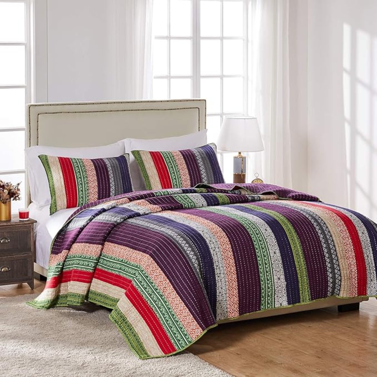 Chic and versatile, the Katy quilted throw features a variety of warm and cool colors. With a broad brushstroke of tasteful tones to compliment any bedroom theme, Katy reverses to a coordinating blue stripe. Channel stitching adds surface interest and durability. Throw dimensions: 50x60”. Made from 100% prewashed and preshrunk cotton.