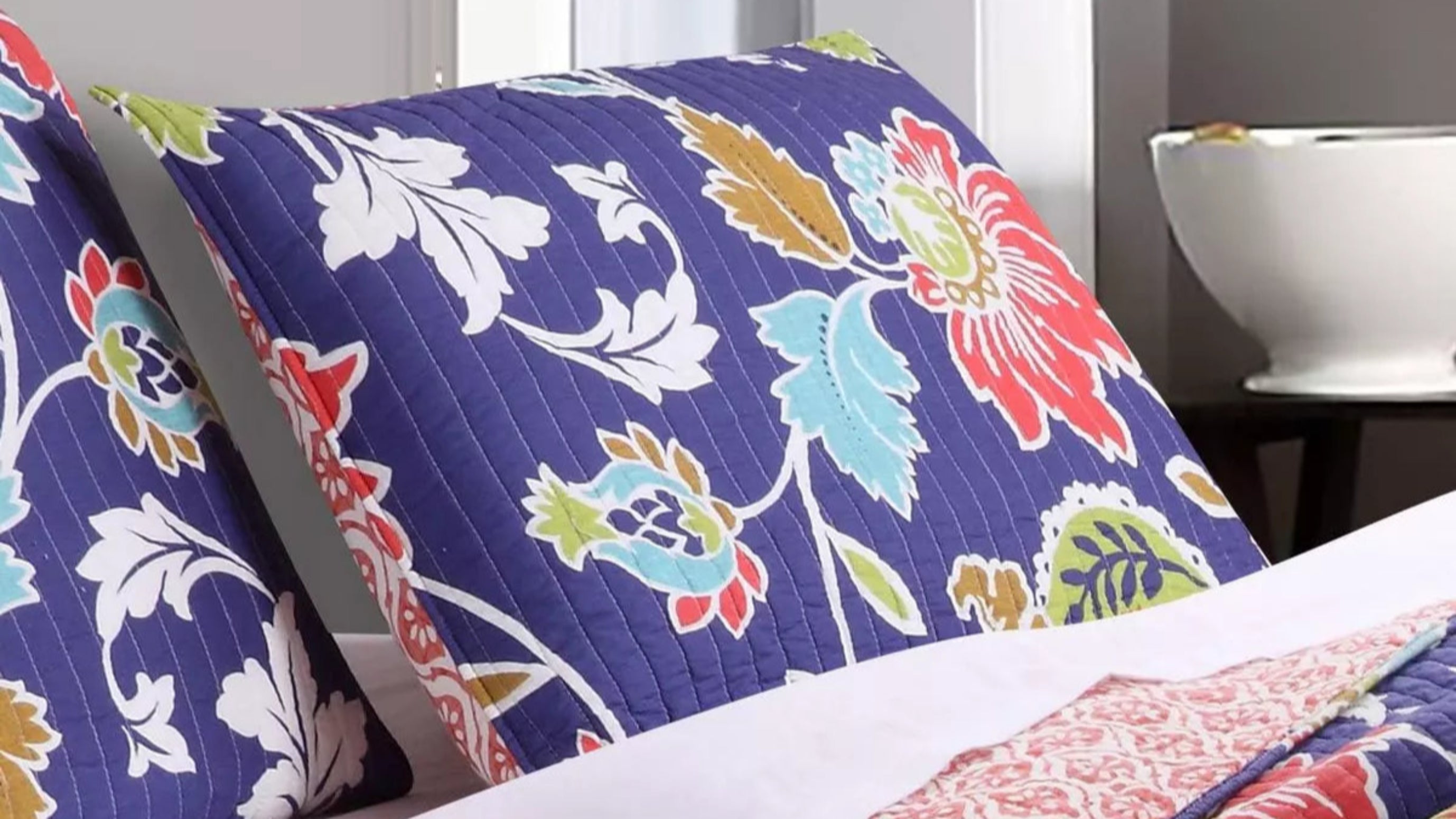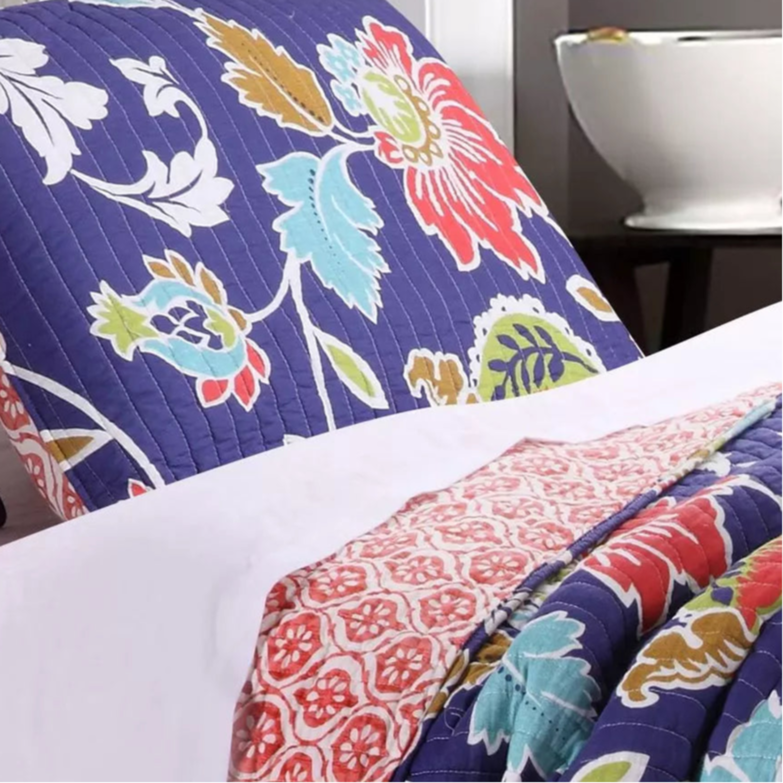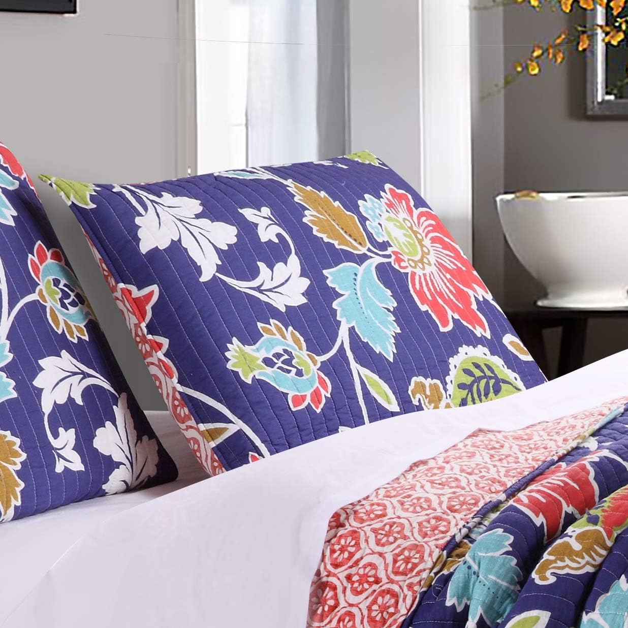 Meandering floral blossoms bring casual elegance to your bedroom space. Featuring stylized flowers and leaves in turquoise, honey mustard, chartreuse, and paprika on a denim blue ground, each Phoebe sham reverses to a an hourglass print in coordinating colors. Prewashed and preshrunk 100% cotton face and back with 100% cotton fill. Machine quilted with fabric bound edges for durability and surface interest. Dimensions: Standard sham 20x26``King sham 20x36`` Dimensions +/- 2`` Machine Wash