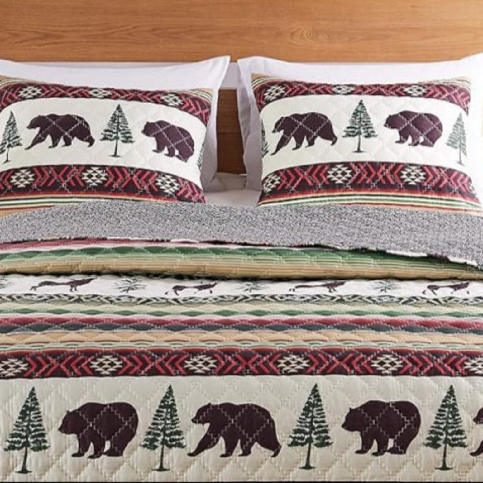 Transform your space with rustic flair. Each Yosemite sham brings a festive new perspective on lodge, with parading bear set among bold stripes and native geometric motifs. Colors include ivory, black, red, green, gold and coffee bean brown. Reversible sham features zippered side closure to hold your pillow in place and a complimentary geometric print on the back in coffee bean brown on ivory. Decorative diamond quilting enhances the durability of each piece. 100% microfiber face and back with 100% polyester fill. Dimensions: Standard sham measures 20x26``. King sham measures 20x36``. Machine Washable