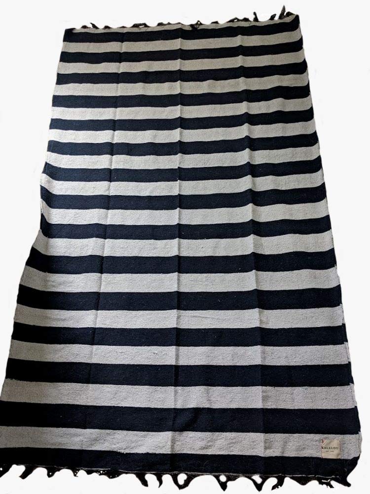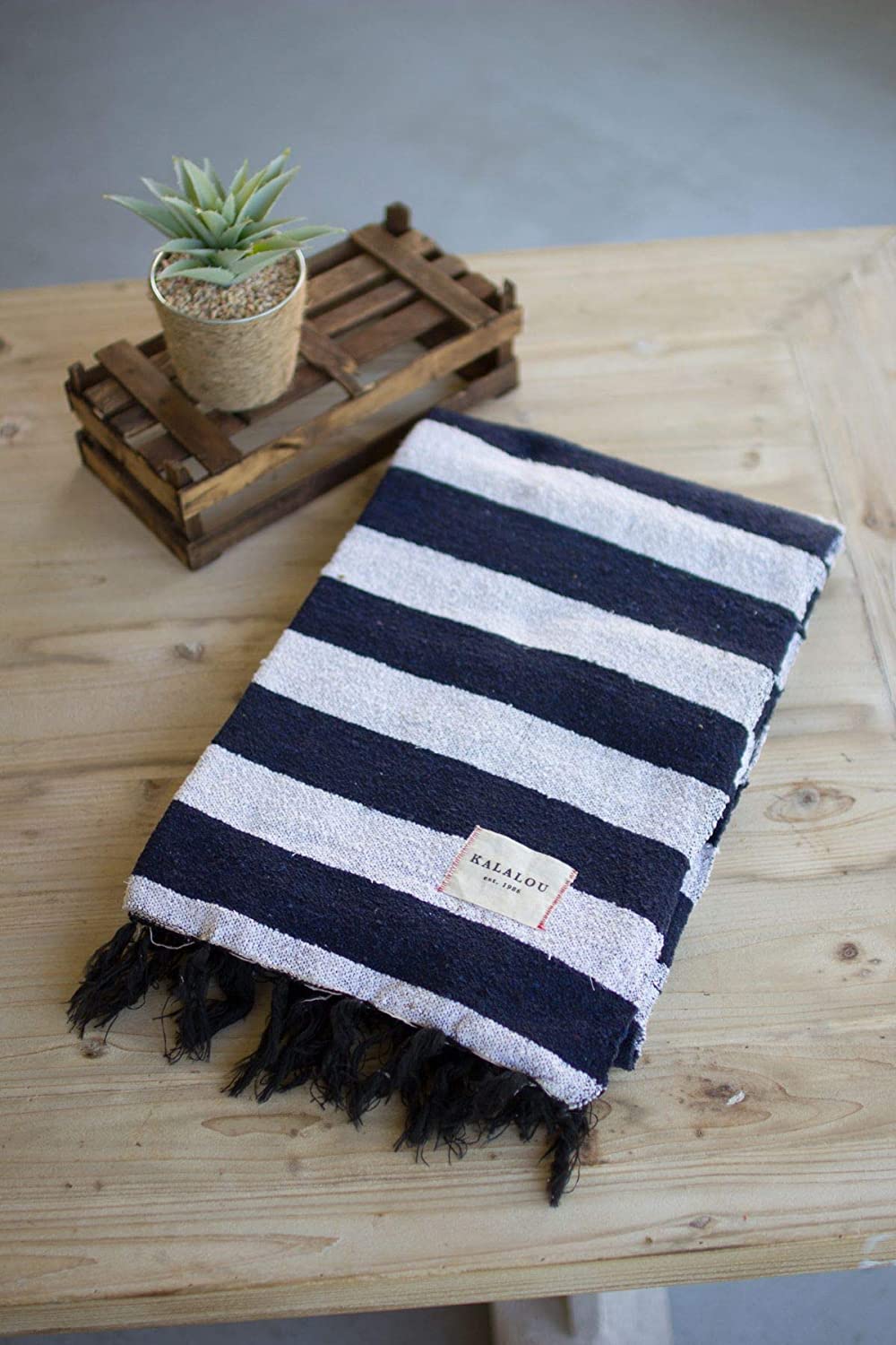 This black fringed blue striped cotton blanket looks great on your chair or couch. This thin 100% cotton throw blanket keeps you warm but not too hot all year long