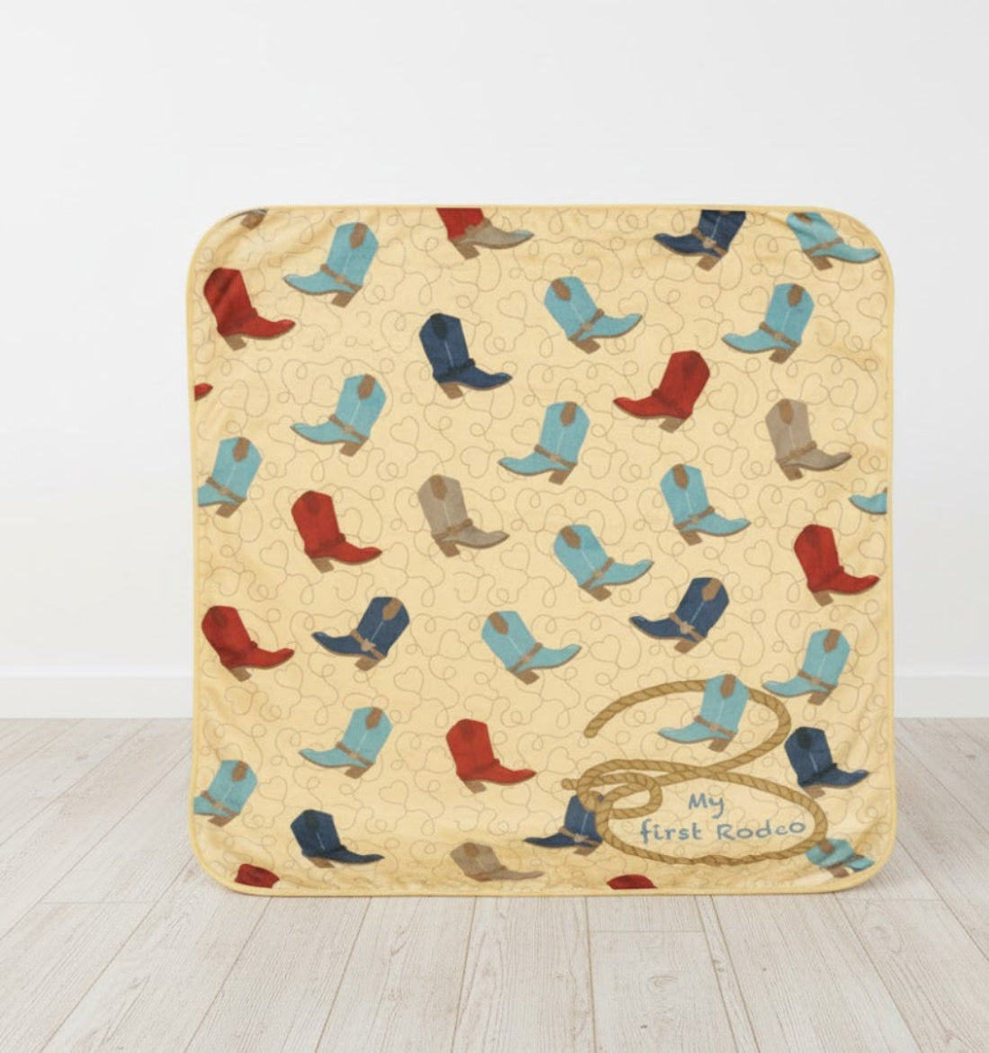 - Design: Blue cowboy boots with “My First Rodeo” theme