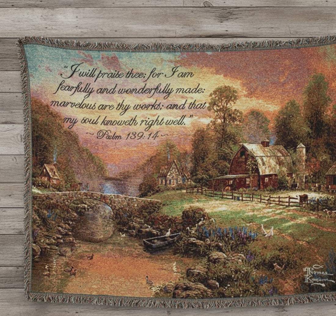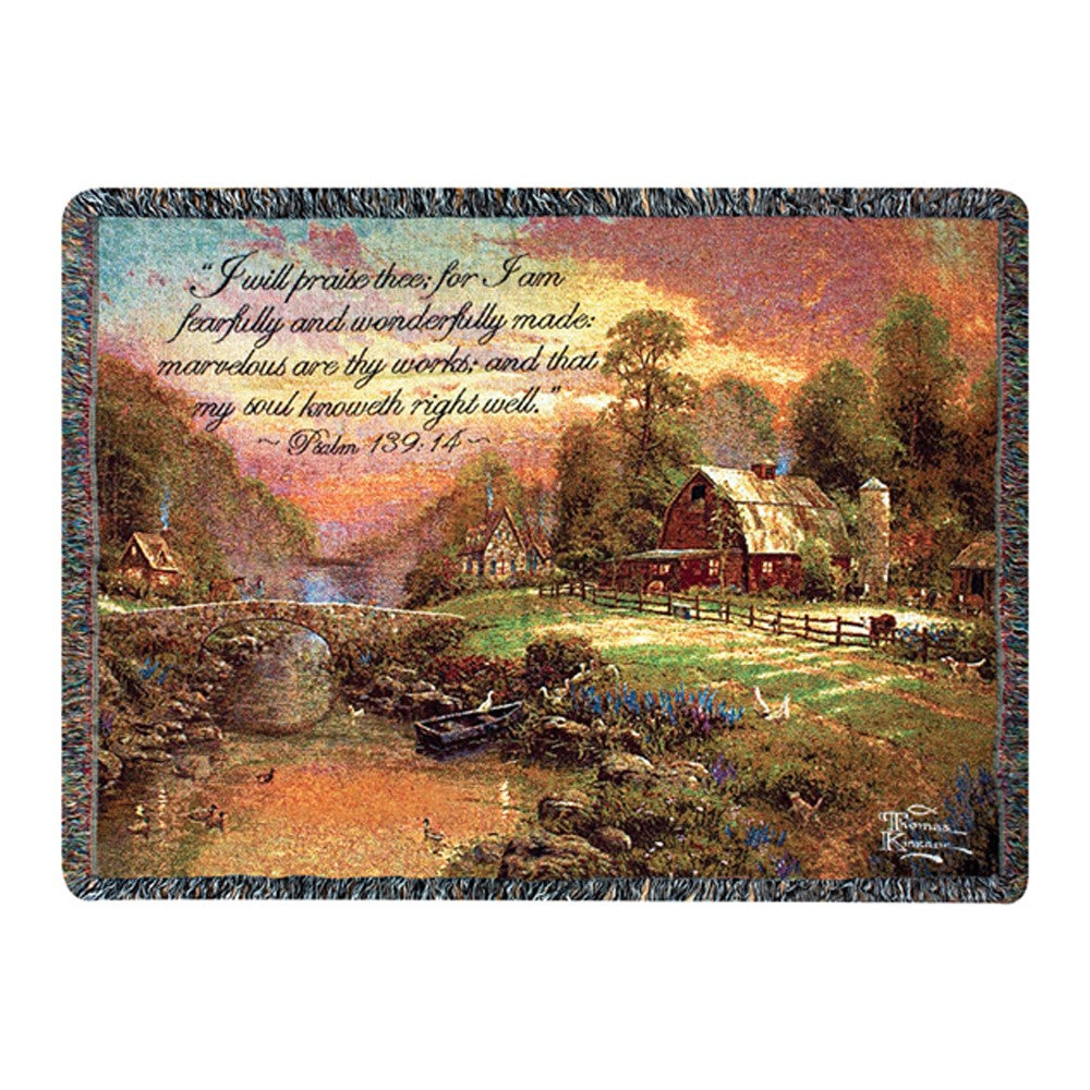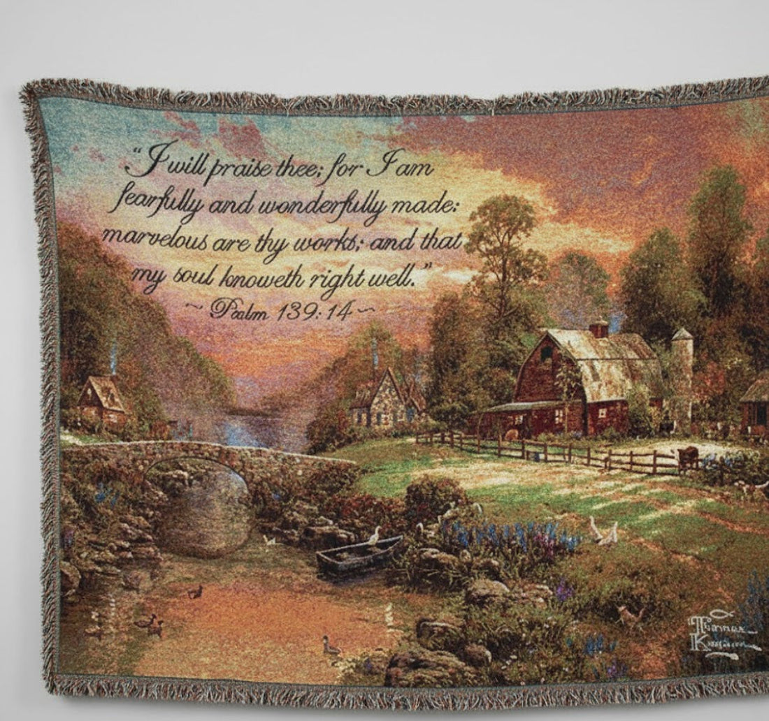 - Showcases iconic Thomas Kinkade artwork in cozy textile form