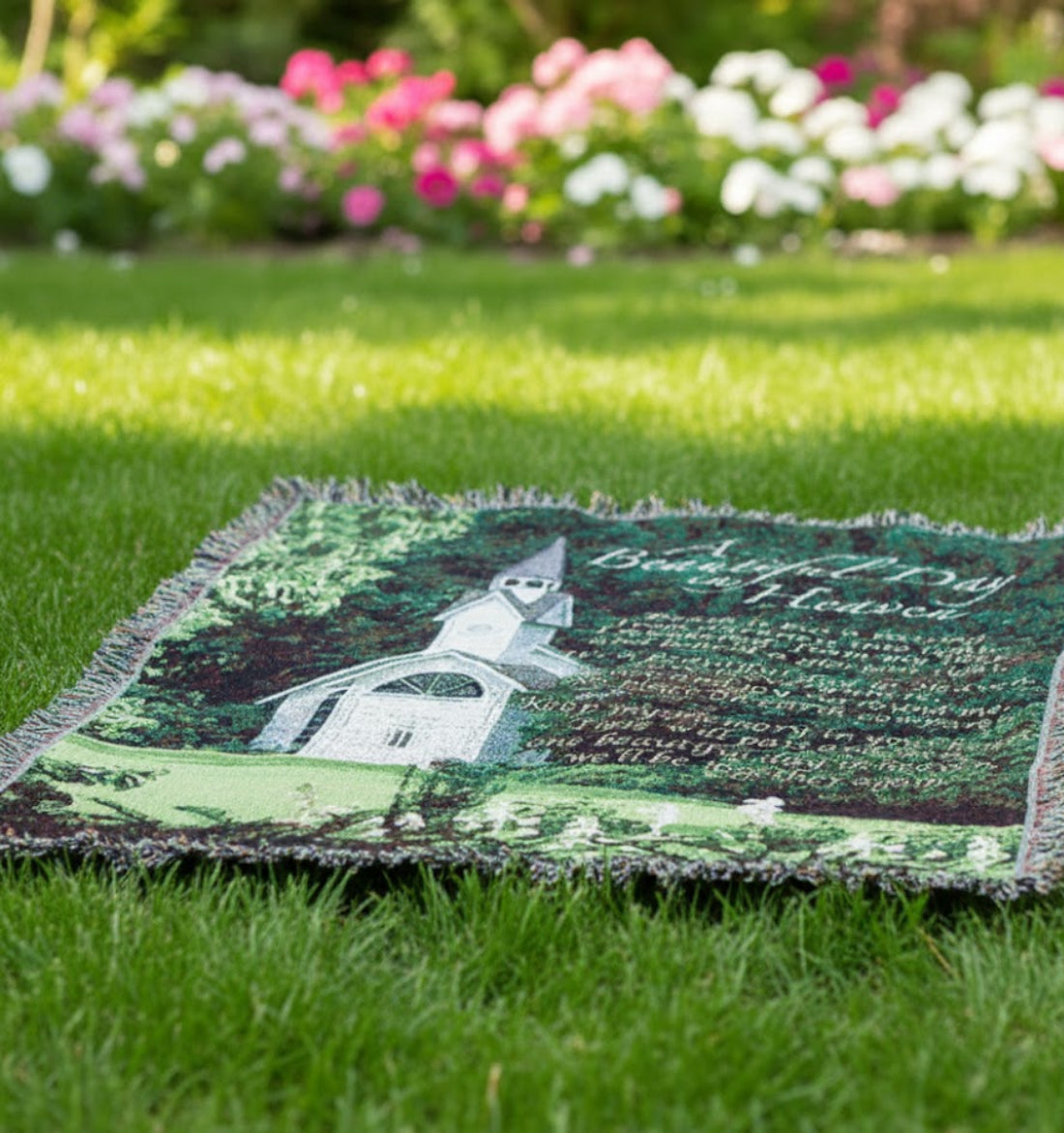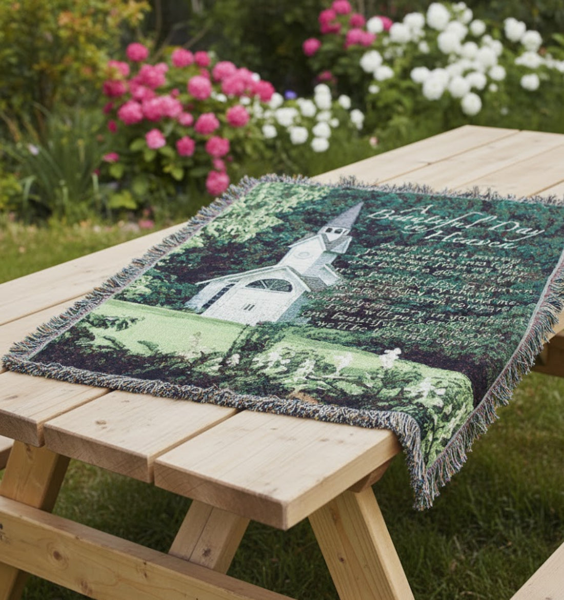 Celebrate eternal peace and remembrance with the Manual Woodworkers A Beautiful Day in Heaven Tapestry Throw. Expertly woven in the USA using 100% cotton, this 50-inch wide by 60-inch-long throw features the heartfelt poem “A Beautiful Day in Heaven,” paired with soft, comforting imagery such as heavenly skies, gentle doves, or glowing light. Whether displayed as a tribute or used as a daily comfort, this throw is a touching way to honor the memory of a loved one and offer solace to those left behind.