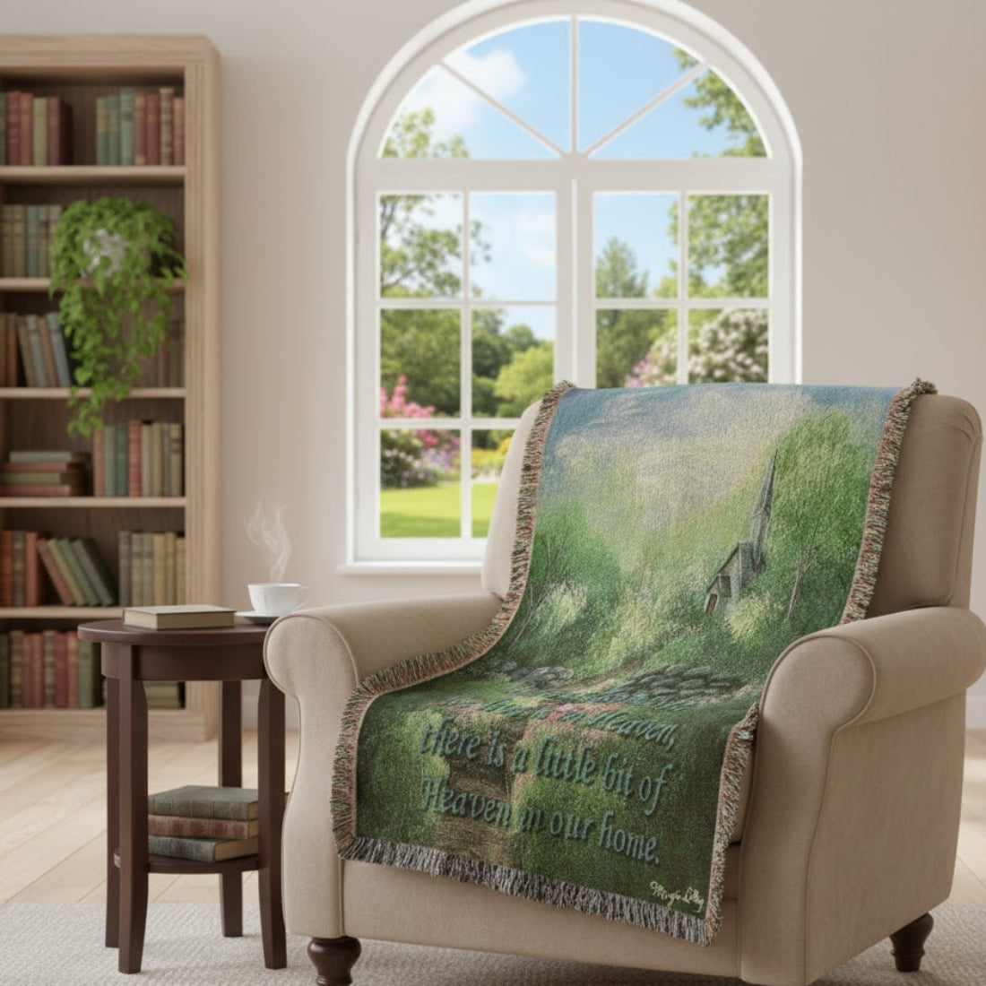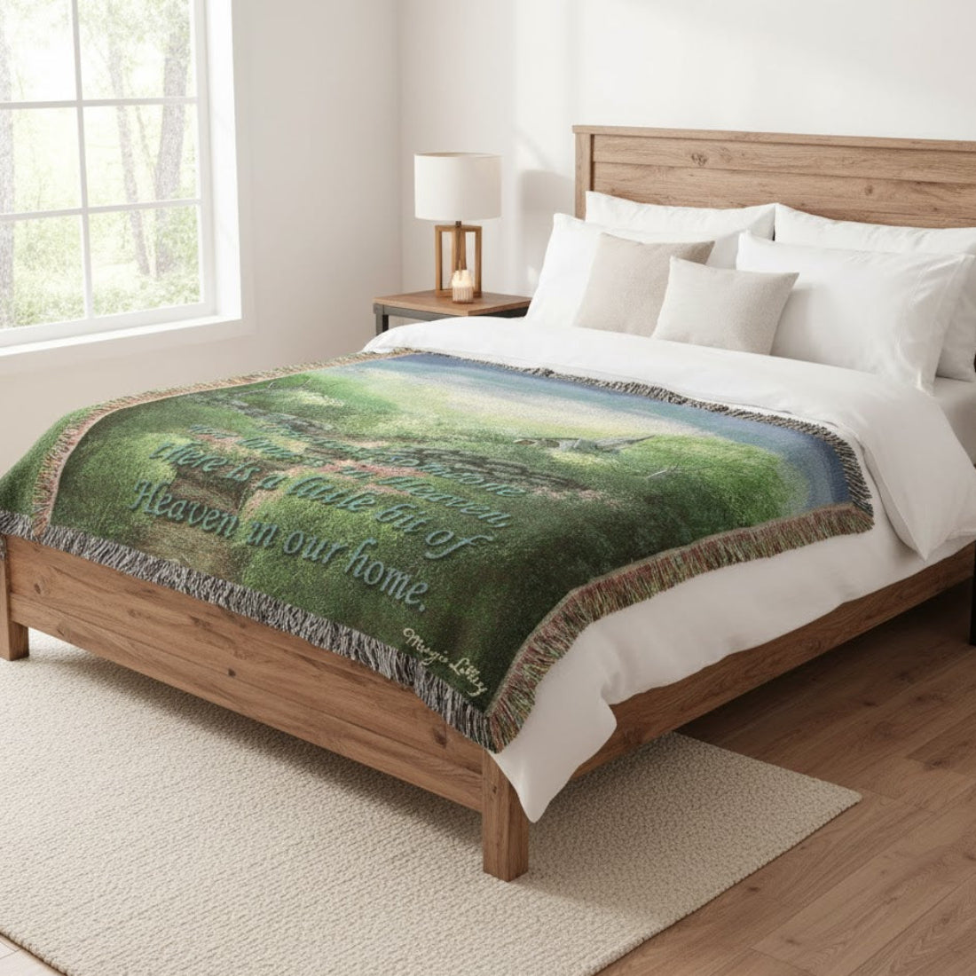 Bring warmth, comfort, and inspiration into your home with the Manual Woodworkers “Little Bit of Heaven in Our Home” Tapestry Throw. Woven from 100% cotton and measuring 50 × 60 inches, this throw combines meaningful words with timeless craftsmanship. Featuring a heartfelt verse and a classic woven design, it makes a perfect accent for your living room, bedroom, or prayer space. Finished with decorative fringed edges, this piece works equally well as a cozy throw, wall hanging, or thoughtful gift for loved ones.