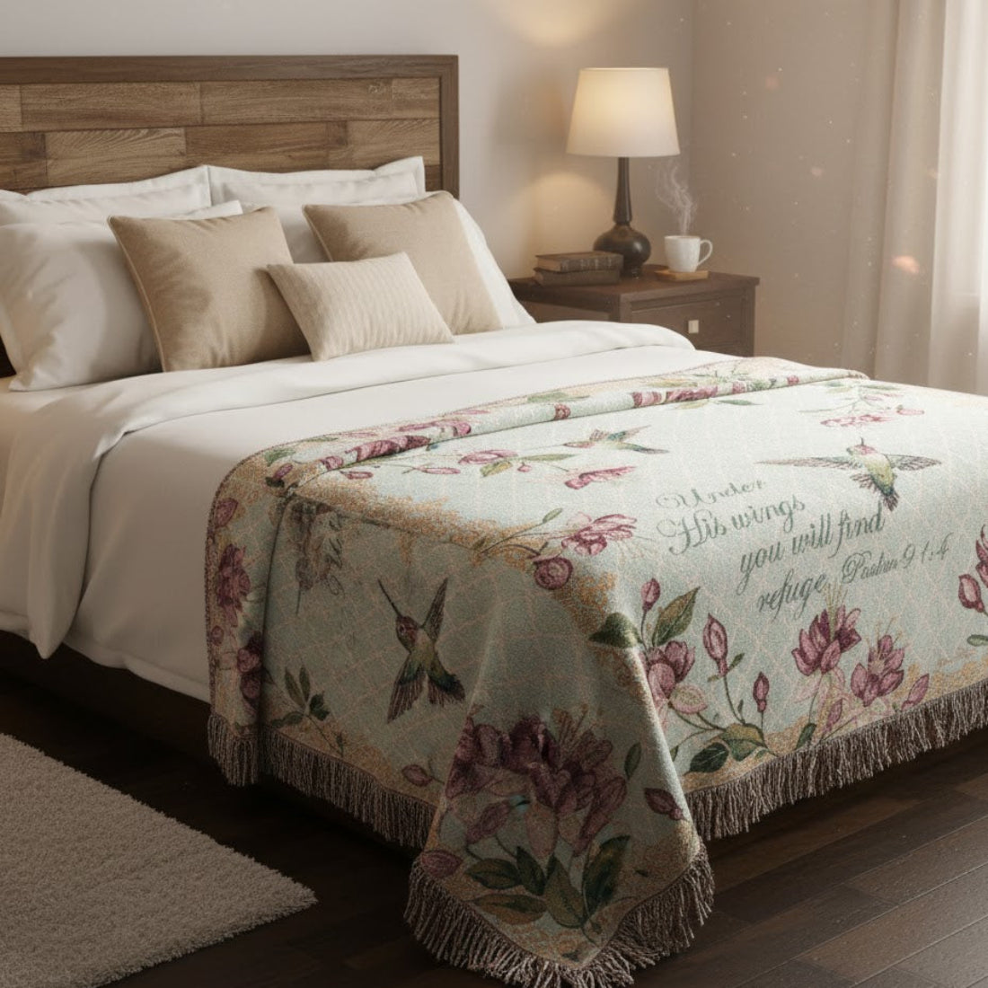 Bring comfort, beauty, and faith into your home with the Manual Woodworkers Tapestry Throw featuring Psalm 91:4. This 50 x 60-inch throw blanket showcases the “Ruby’s Among the Fuchsias” design—a graceful blend of soft florals and vivid fuchsia tones that frame the scripture: “He shall cover thee with his feathers, and under his wings shalt thou trust.” Crafted in woven tapestry style, this throw adds a warm, traditional touch to sofas, reading nooks, or prayer spaces. Drape it over a couch, hang it as wall art, or use it as a meaningful gift. The horizontal orientation enhances its versatility for display or use.