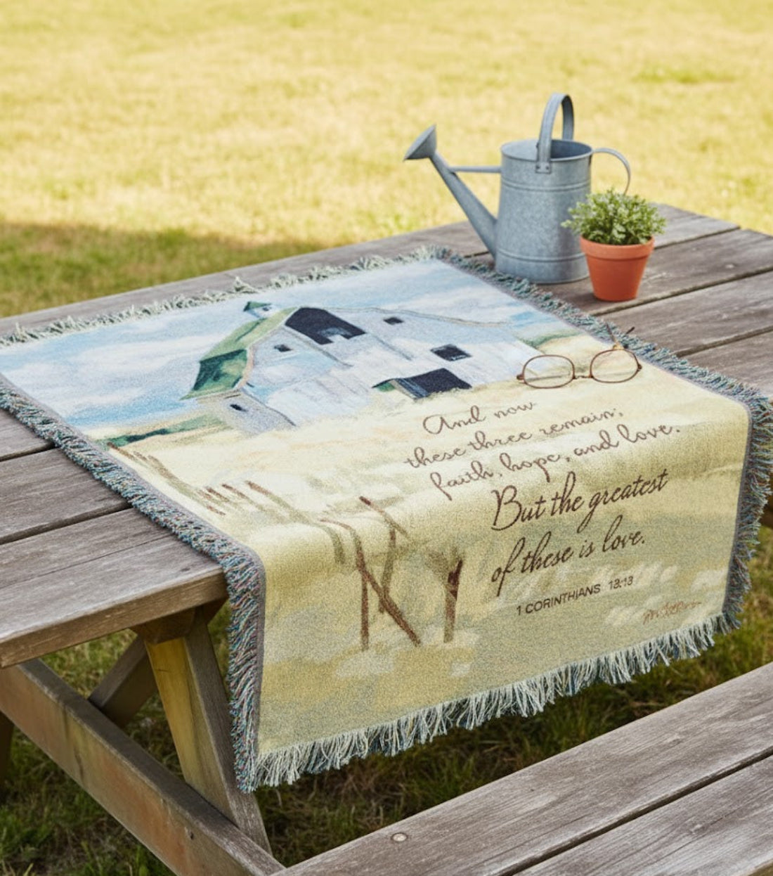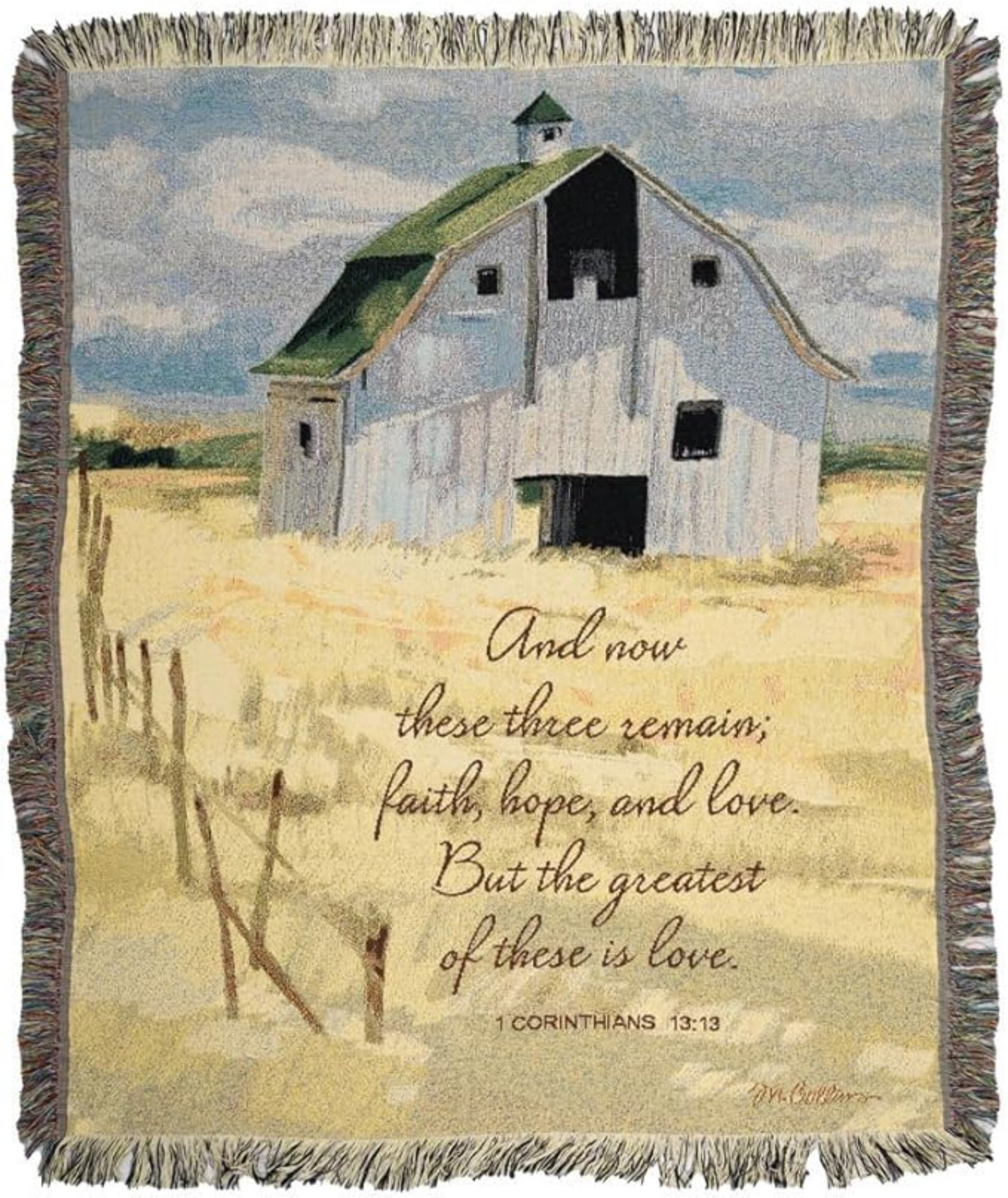 The Sheffield Farms Tapestry Throw by Manual Woodworkers brings rustic beauty and timeless inspiration to your home. Woven from 100% cotton, this 50 × 60-inch multicolor throw showcases a farm-inspired design paired with a thoughtful verse that uplifts and comforts. Finished with decorative fringe, it is soft, durable, and suitable for all-season use. Perfect for draping over a sofa, chair, or bed, or for displaying as wall décor, this blanket offers a warm blend of function, artistry, and inspiration. A meaningful gift for friends and family who appreciate faith-filled country charm.