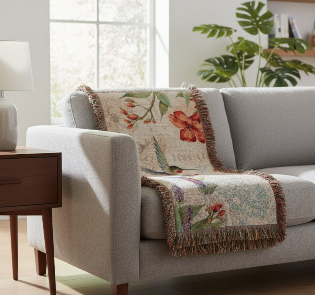 Bring the beauty of nature into your home with the Hummingbirds Woven Throw. Expertly crafted from 100% cotton, this 50x60-inch throw features a detailed hummingbird motif that captures the elegance and energy of these graceful birds. Its woven texture adds warmth, comfort, and artisanal charm to your space. Perfect for layering over a sofa, chair, or bed, this throw complements both modern and cottage-style interiors. Ideal for daily use or gifting, it adds a refreshing touch of color and tranquility to any room.