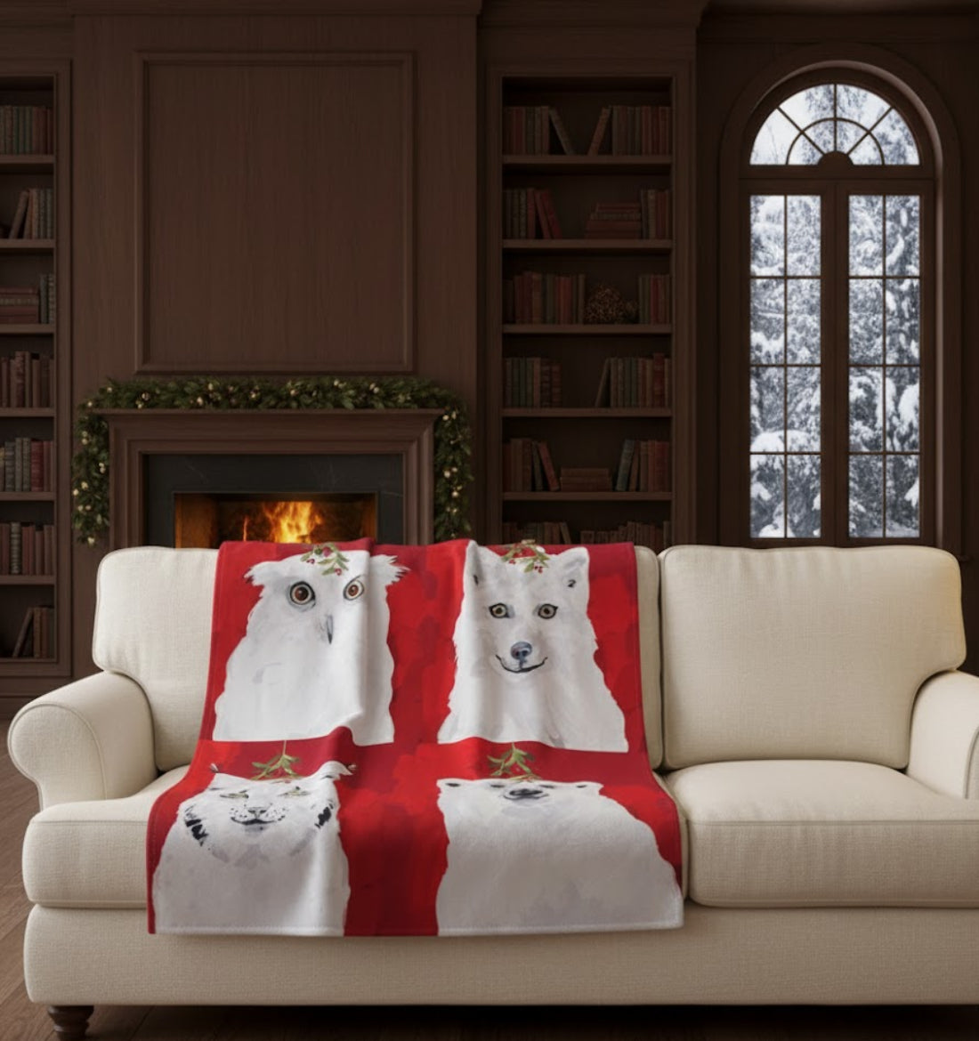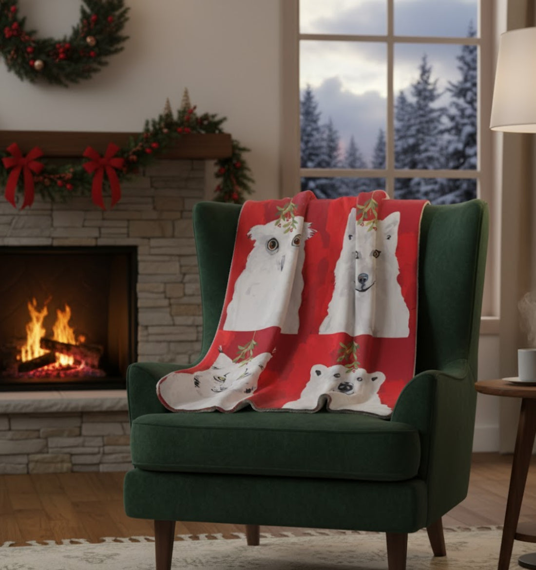 White Sherpa Fleece Throw 50"x60" Holiday Animal Design by Manual Woodworkers