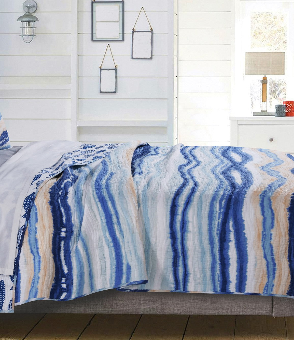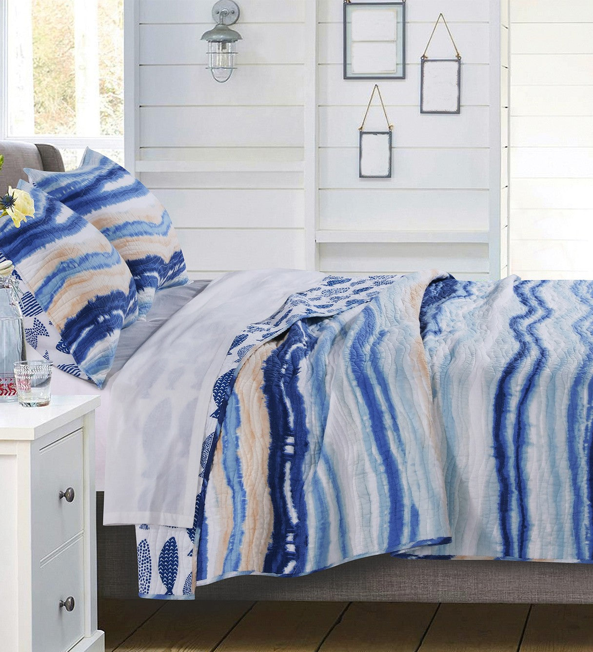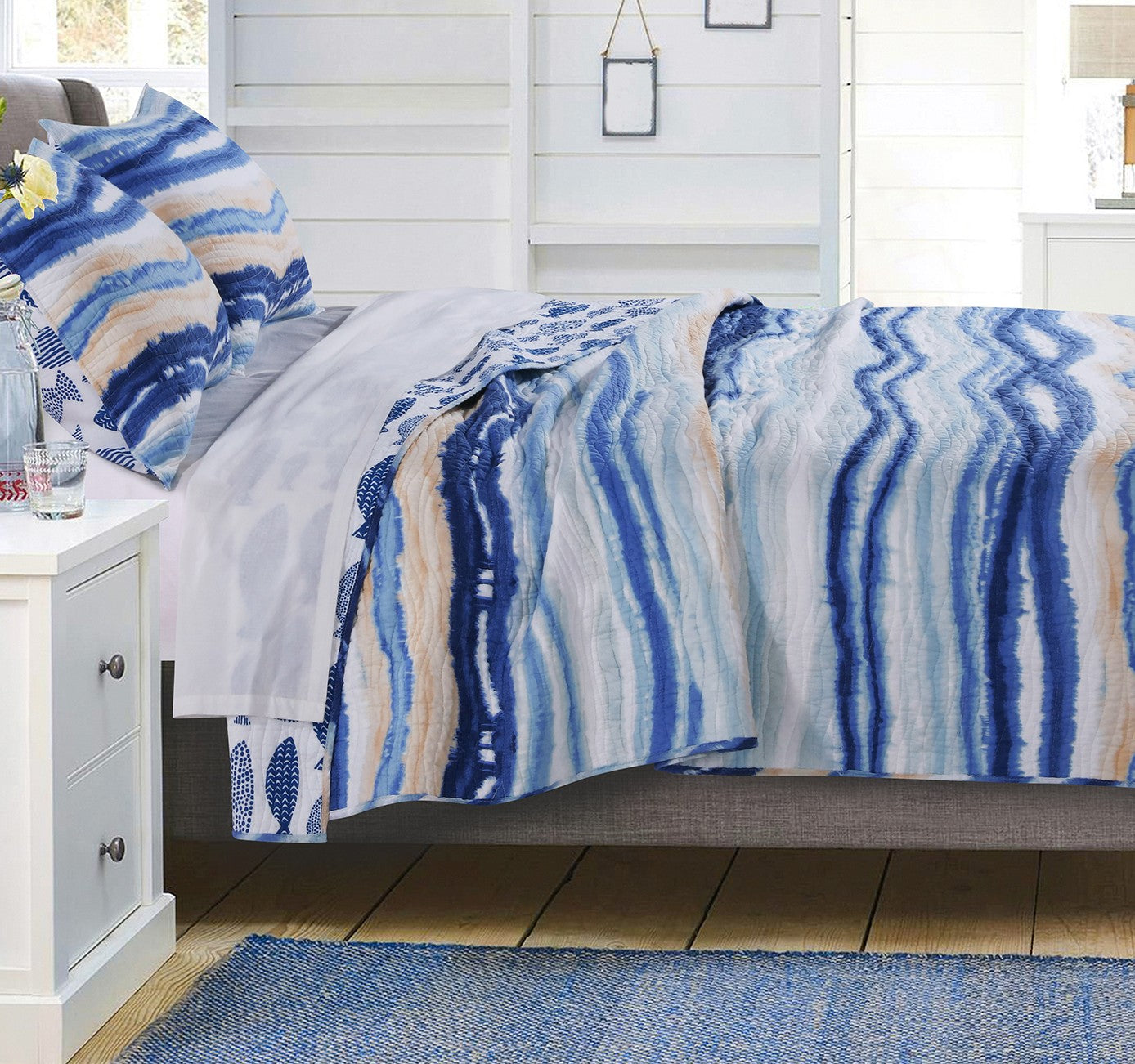 SKU - GL-1801CMSKCrystal Cove Blue Quilt Set 3-Piece Coastal Wave Pattern