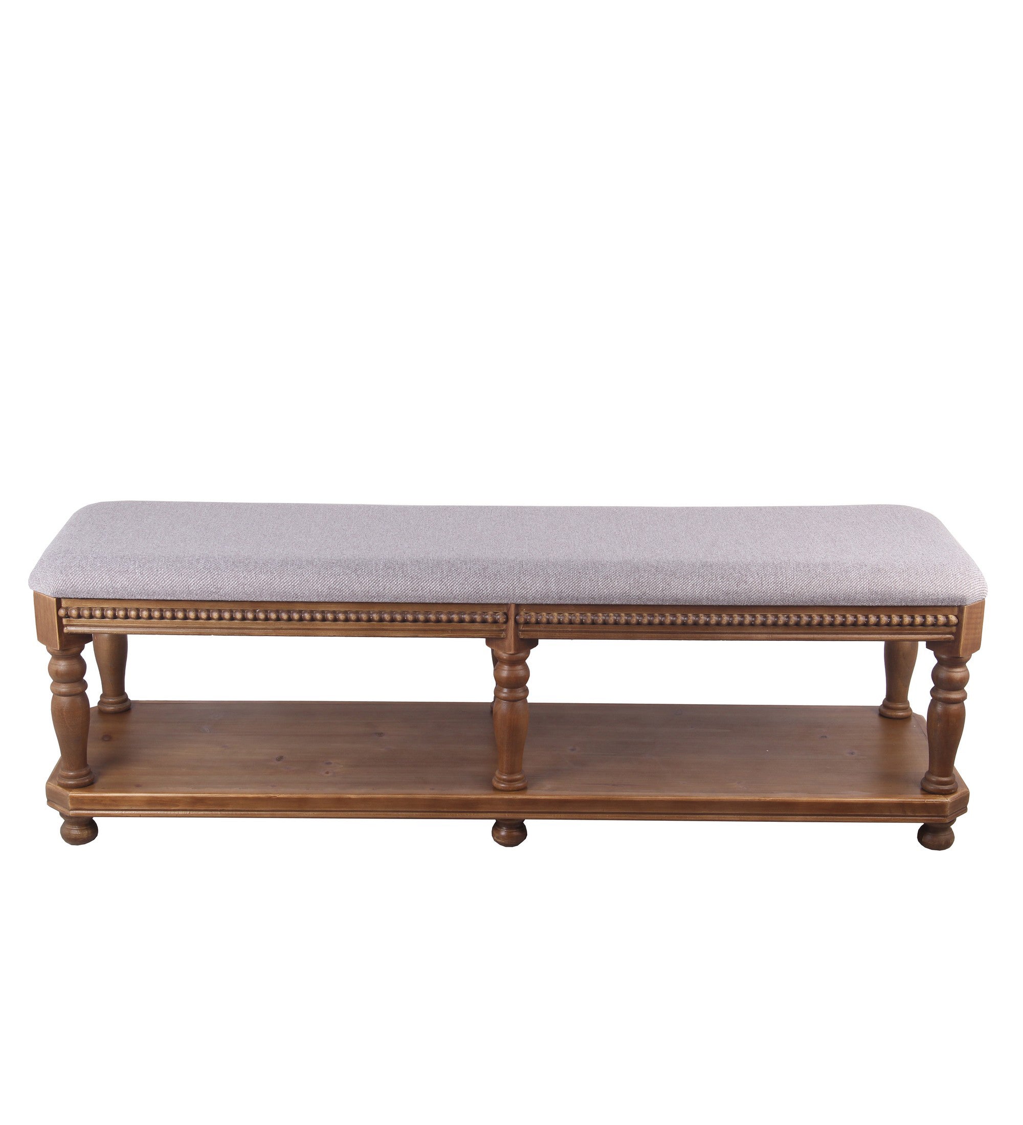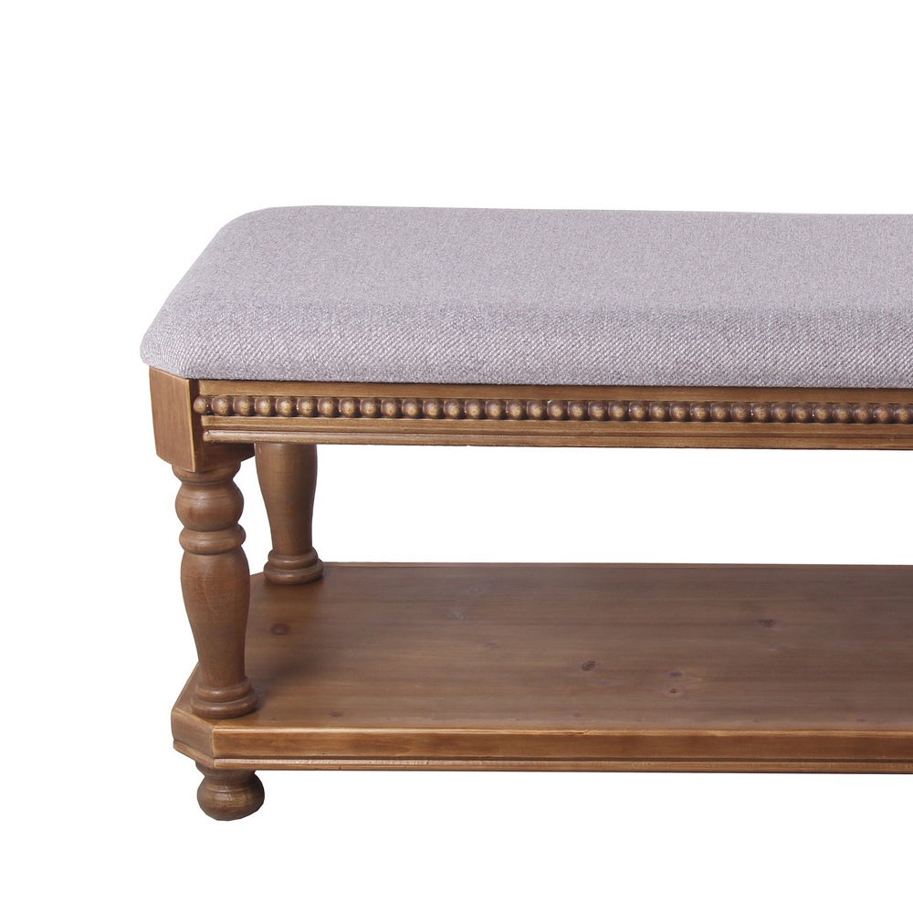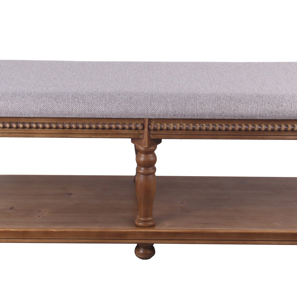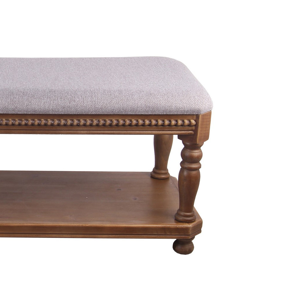 Glam up your casual sitting area with this unique Wooden Bench. Featuring rectangular Wooden frame with beaded edges and gray fabric padded seat for extra comfort, it is supported on turned legs. The open bottom shelf provides extra storage space.