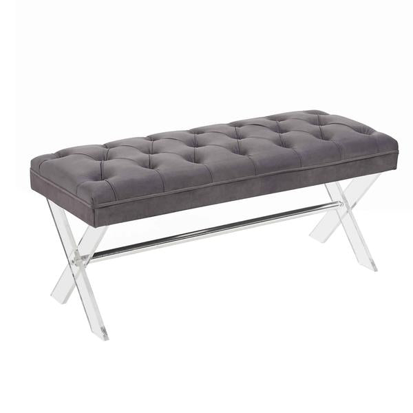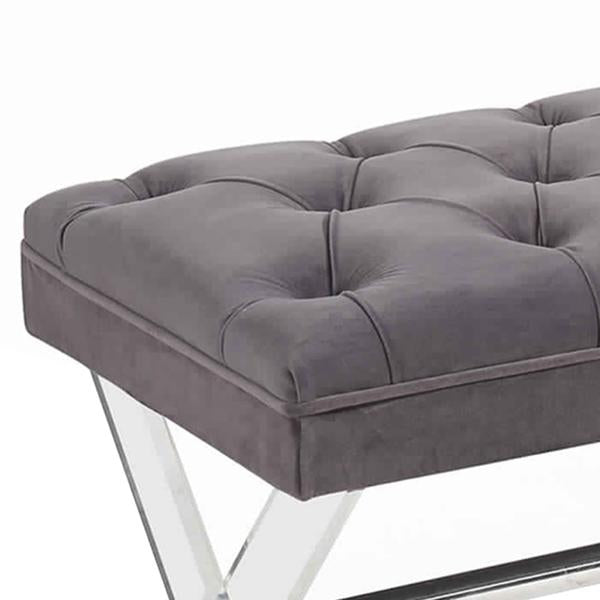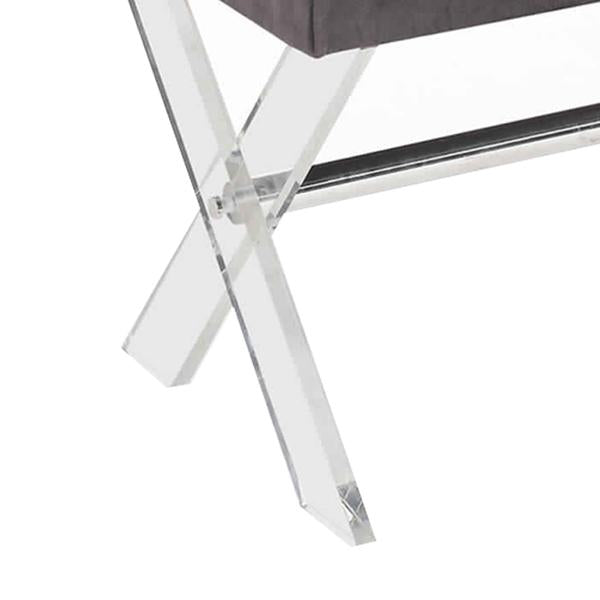 Designed with class and craftsmanship, this sturdily constructed ottoman bench will adorn your interior setting. Upholstered in gray velvet fabric, it has crystal button tufted high density cushioned seat for enhanced comfort. The X shaped acrylic base which enforces sturdiness and adds to the uniqueness of this ottoman.