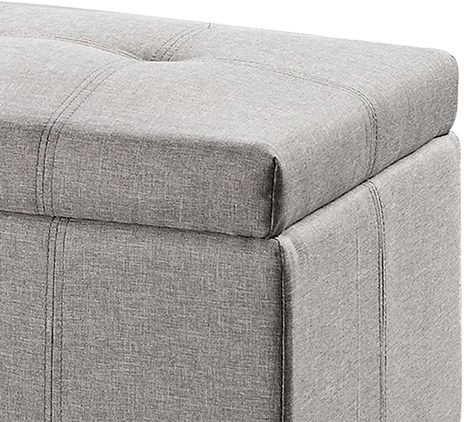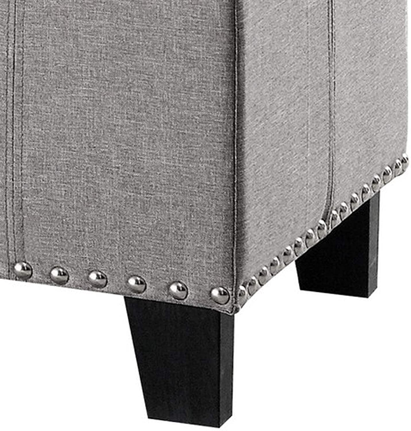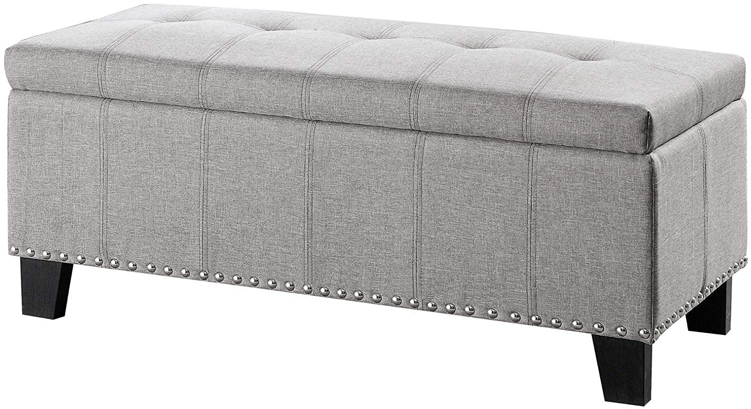 Revolutionize your space with this rectangular shape Bench which brings utility to the spaces that need it most. It is upholstered in light gray fabric with stitching details and nailhead trim that add a dose of glamour to your space. The button tufted top opens to reveal ample storage space. This piece will offer a beautiful blend of style and comfort in your living room.