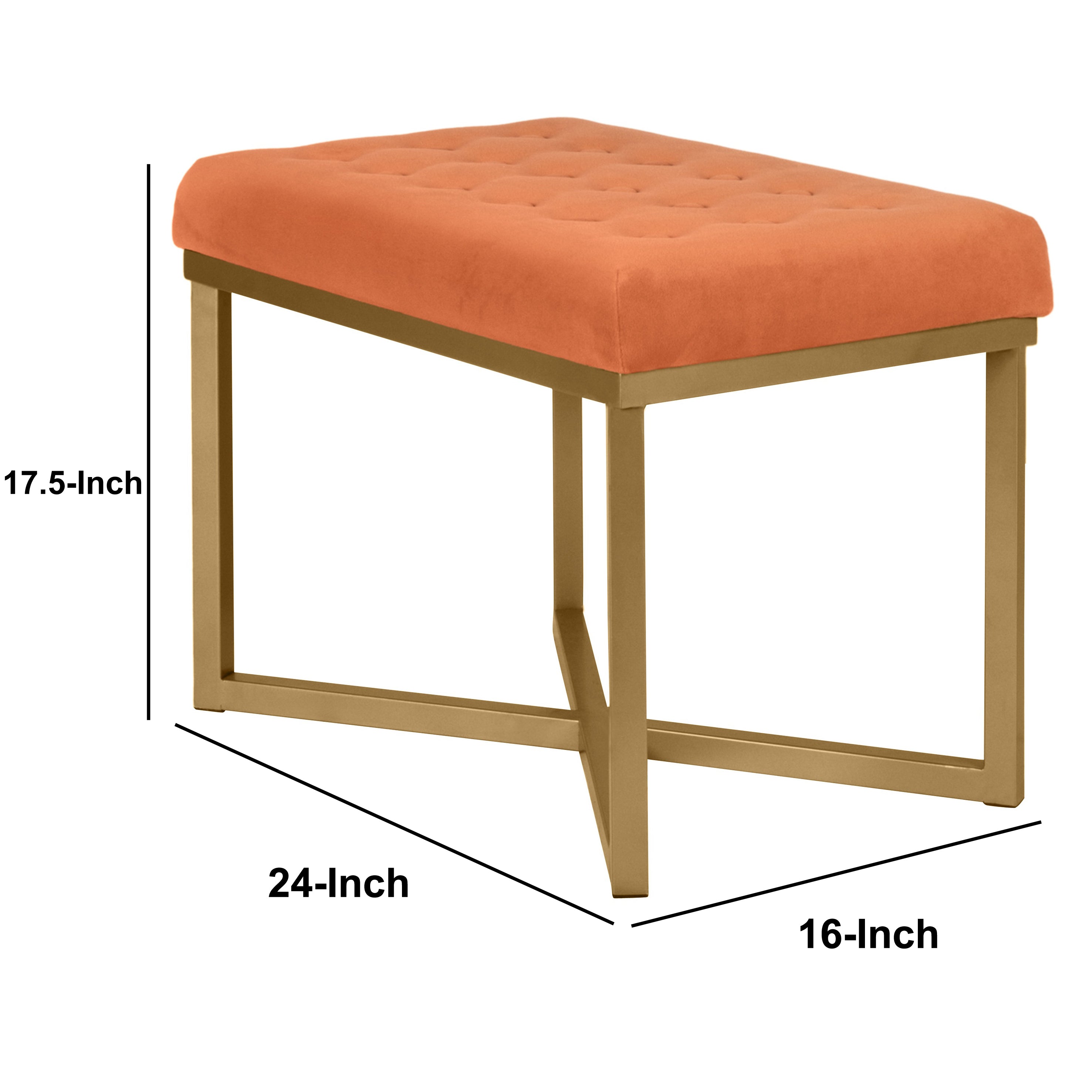 Upgrade your living space by the addition of this simple yet stylish bench that will add a classic touch to your home. Supported by designer metal frame in gold finish, this bench features orange velvet upholstered cushioned seat with button tufted detailing and sleek metal legs with X shape base support. The sturdy legs incorporates floor protectors that provide scratch free mobility. You can combine two benches for a smart look and functional seating solution at the end of your bed, in your entryway or living room.