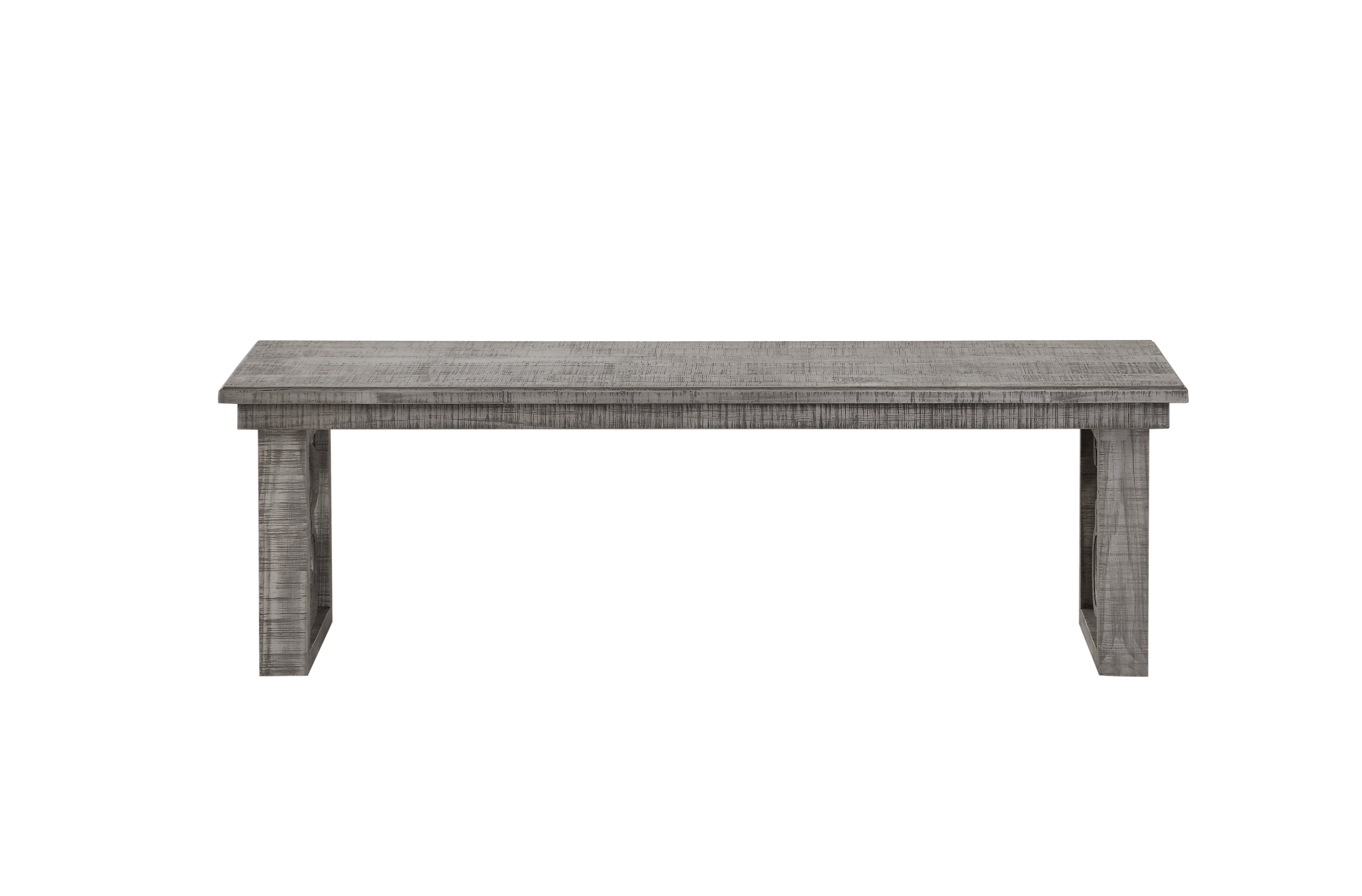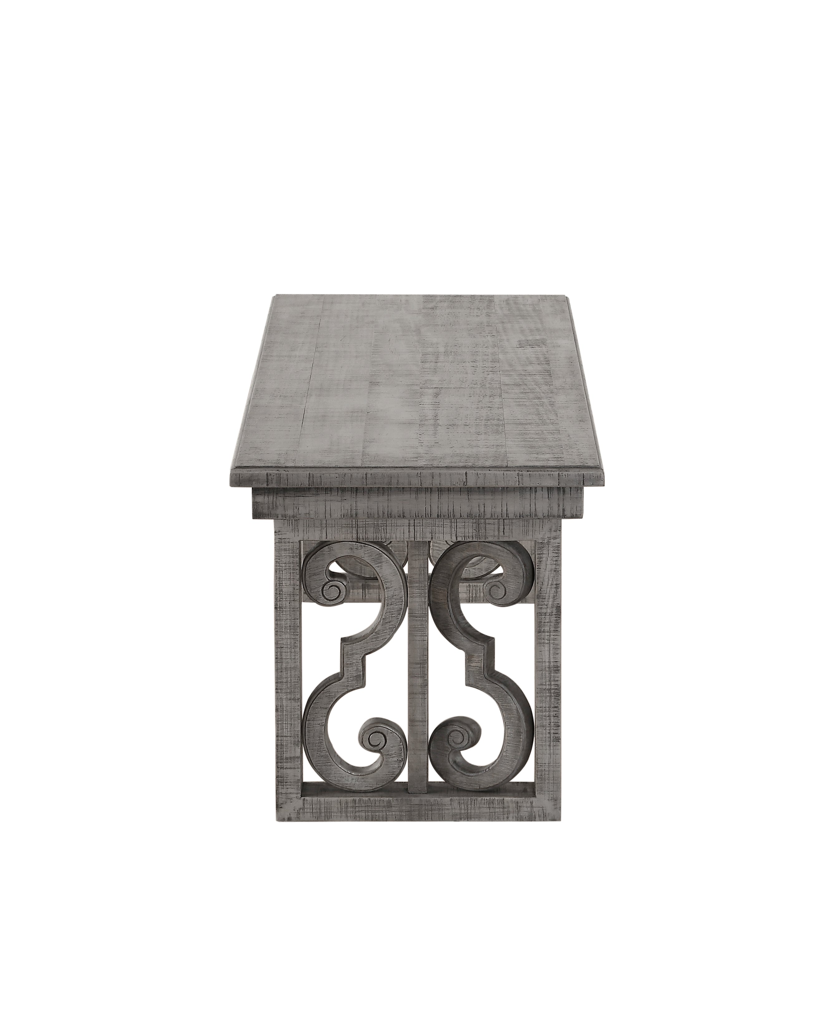 Combining classic and rustic elements, the bold curves of this Bench provides both an elegant contrast and a unique look to any dining area. Constructed from durable wood in a salvaged grey finish, this bench strikes a rectangular silhouette with thick sides. Its wide sled legs are adorned with an ornate scroll motif lends a note of sophistication to the piece, while its wide seat provides place for two diners. Perfect as a dining bench or entryway bench, this piece will inspire a timeless look that will endure for years to come. Note: Other featured items in image except this bench are sold separately.