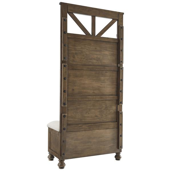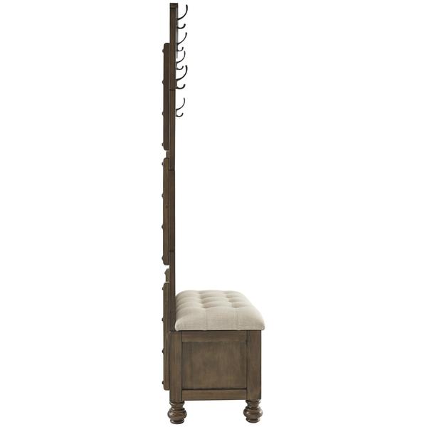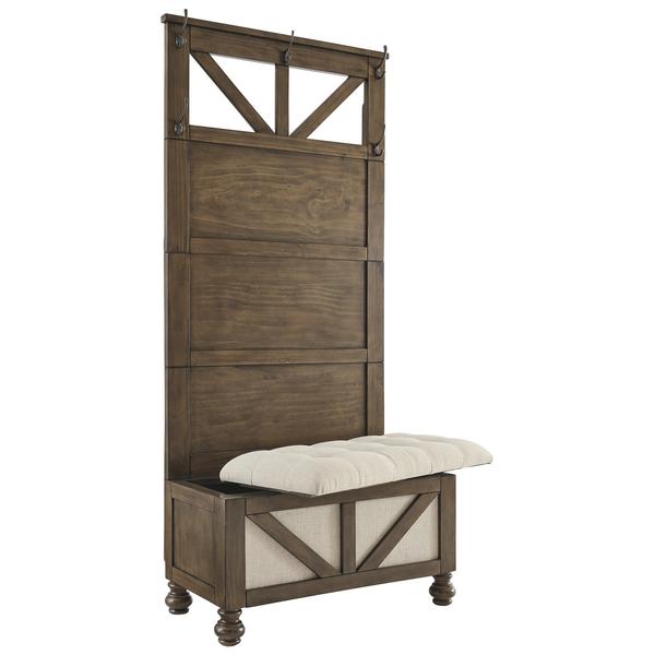Add extra seating and storage space to your living room with the inclusion of this sturdy wooden constructed bench featuring barn design. Supported on turned feet, it has hidden storage beneath the polyester upholstered tufted padded seat which completes the structure. Attached hall tree with 5 hooks provides a place to hang your umbrella and scarves.
