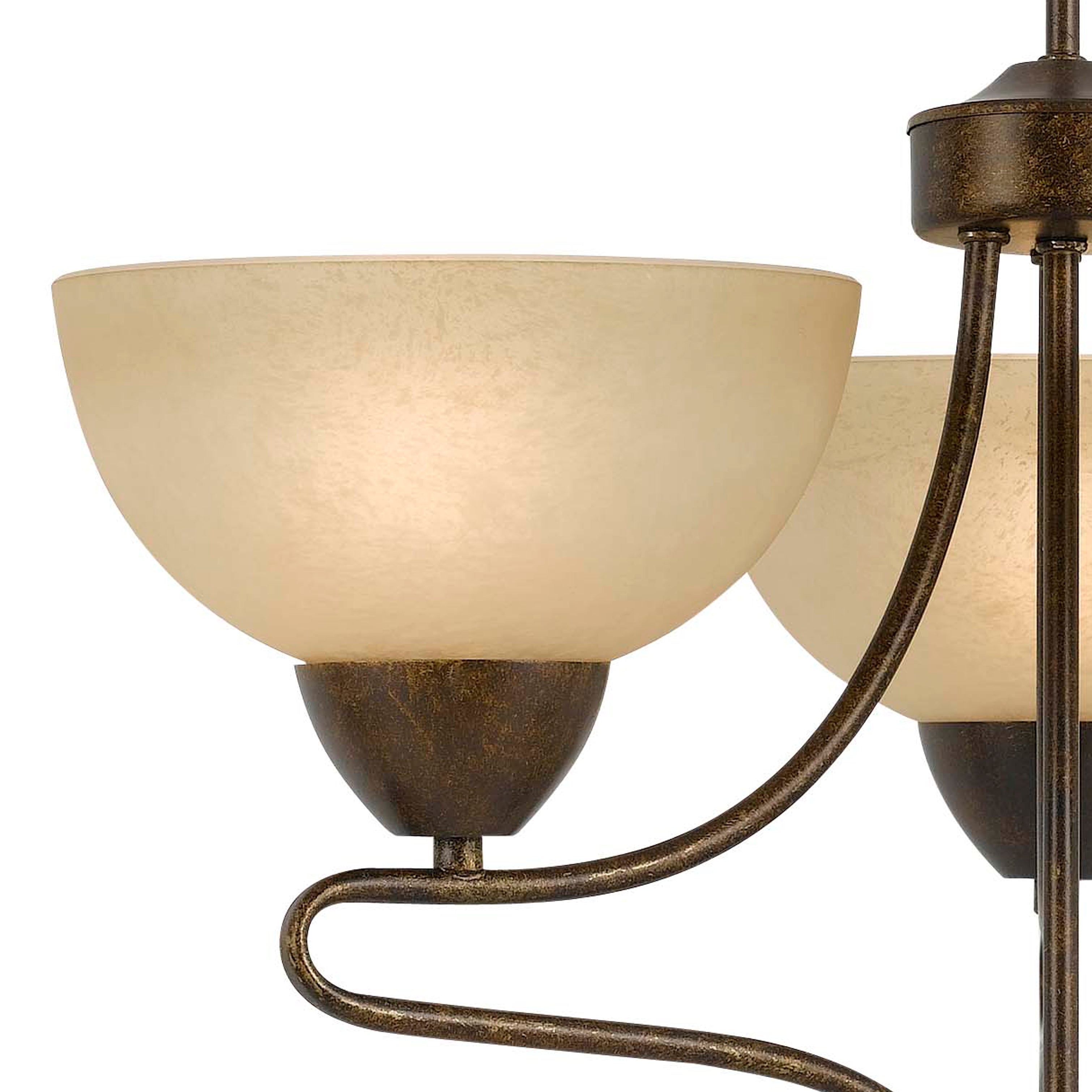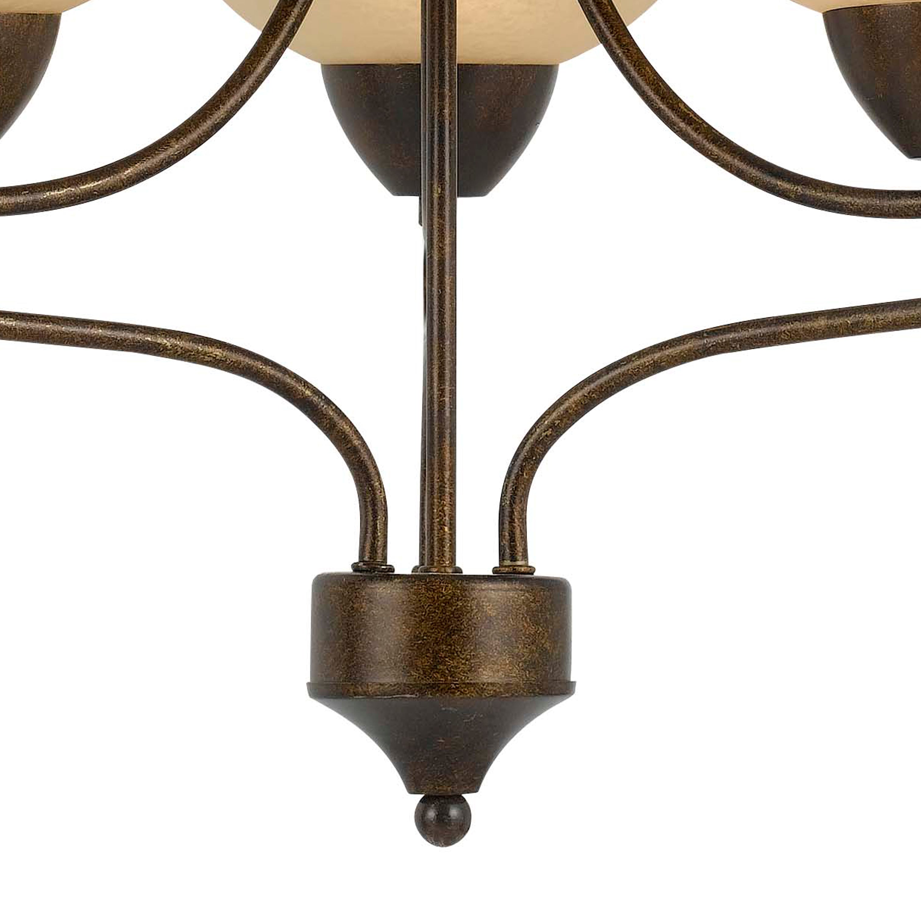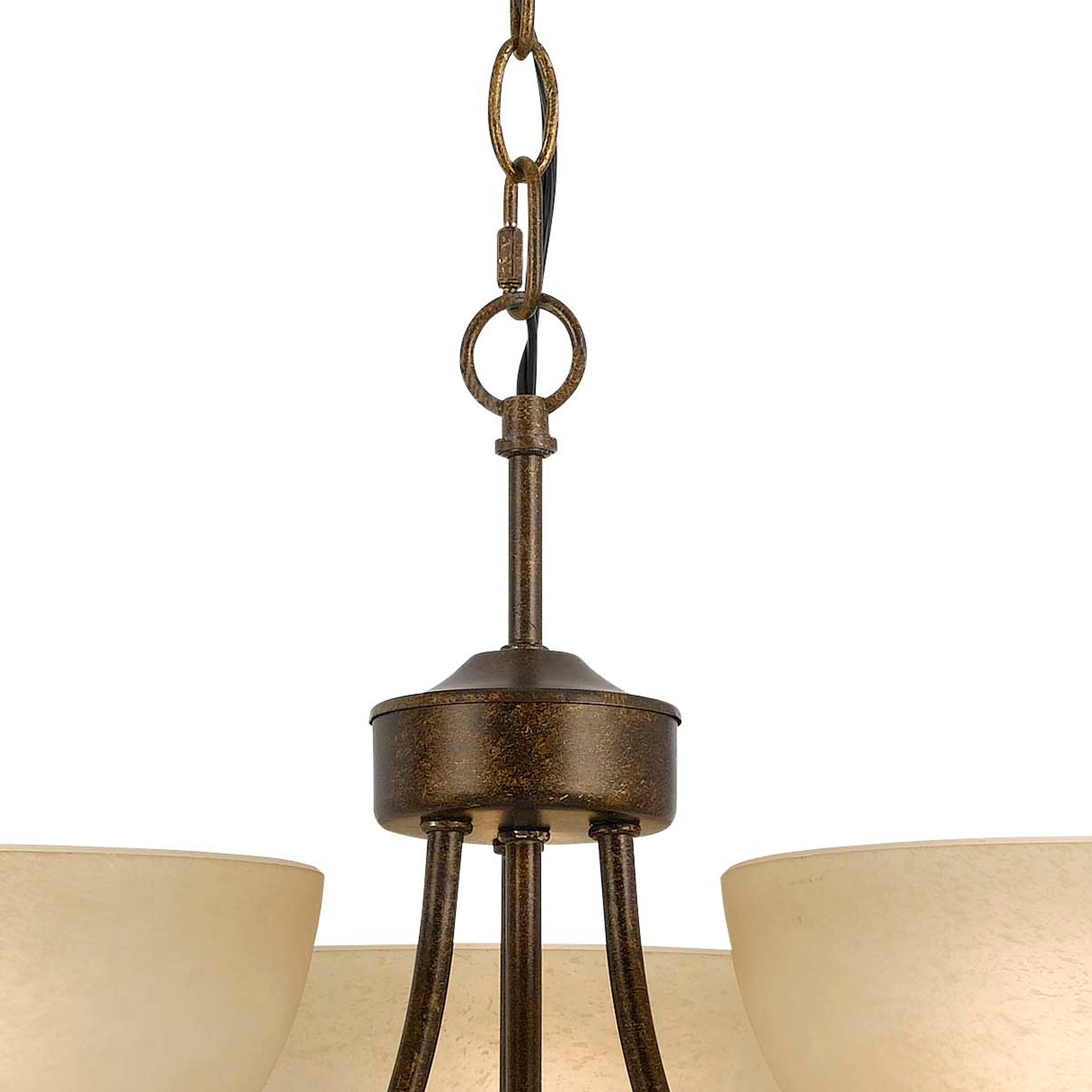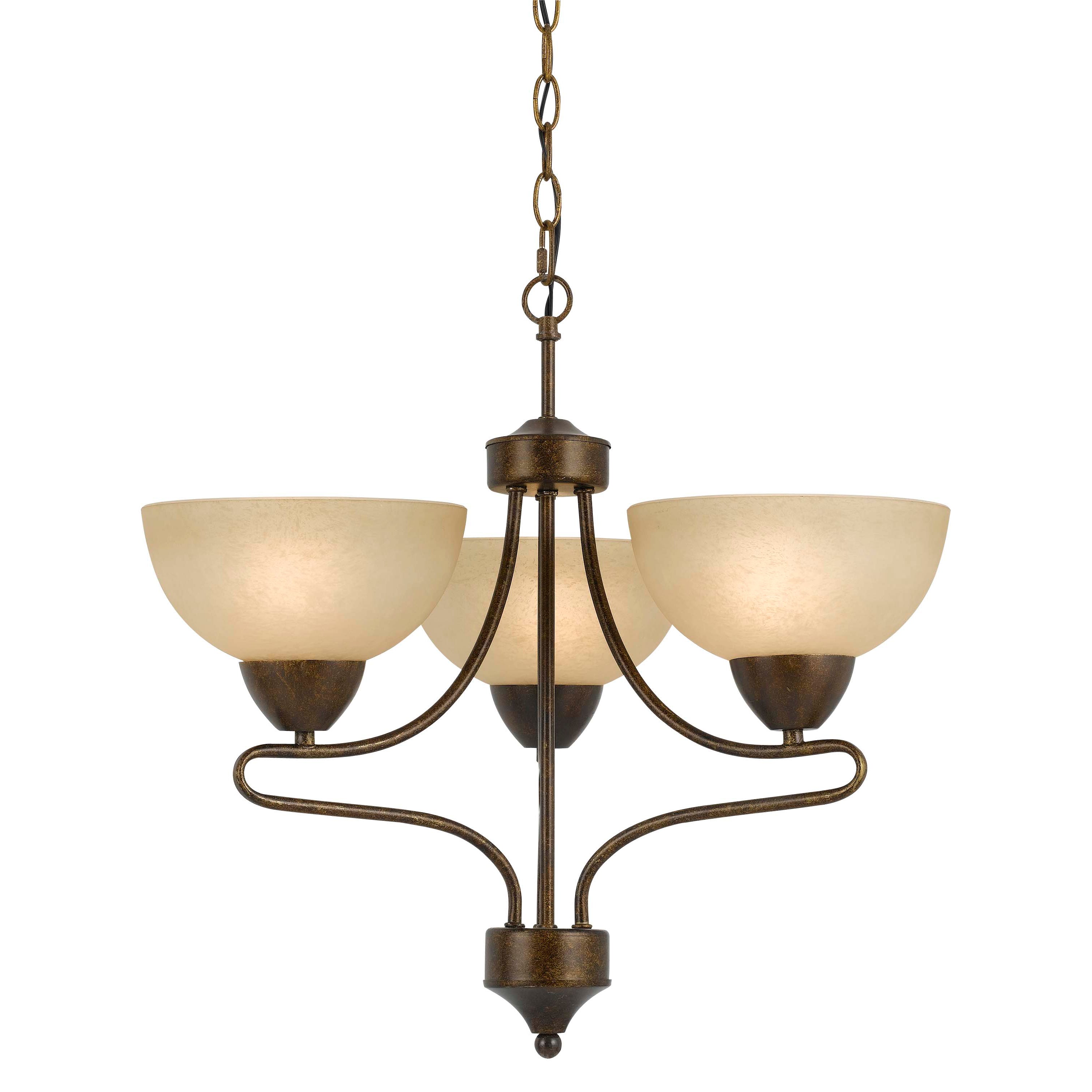 Transform the aesthetics of your living space by the inclusion of this beautiful chandelier. It features a tubular metal frame in a bronze finish, incorporating 3 glass shades in beige finish. It is provided with a 6 feet long chain and 10 feet long wire, providing easy mounting and connection.