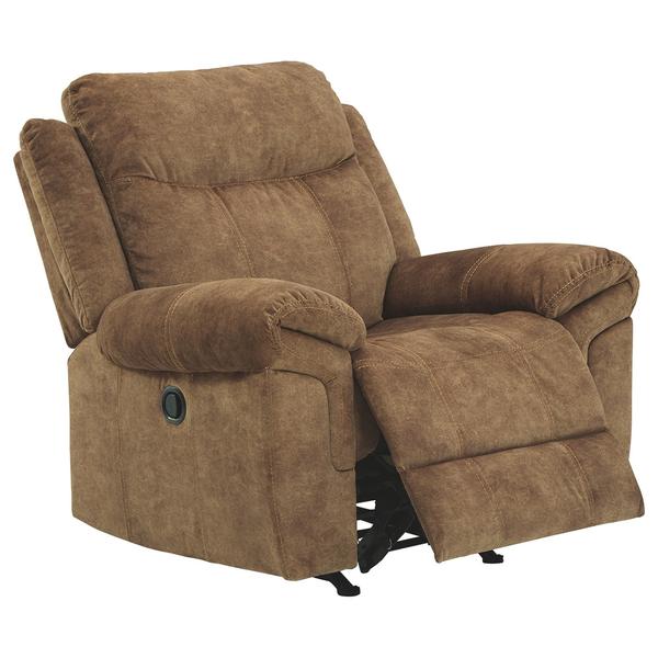 Introduce comfort and luxury to your living space by brining in this sophisticated and elegant recliner. Upholstered from fabric in the hue of brown, it features a pull tab reclining motion and a gentle rocking motion, incorporated with pillow top armrests for comfort. It showcases stitched details, adding to its beauty and elegance.