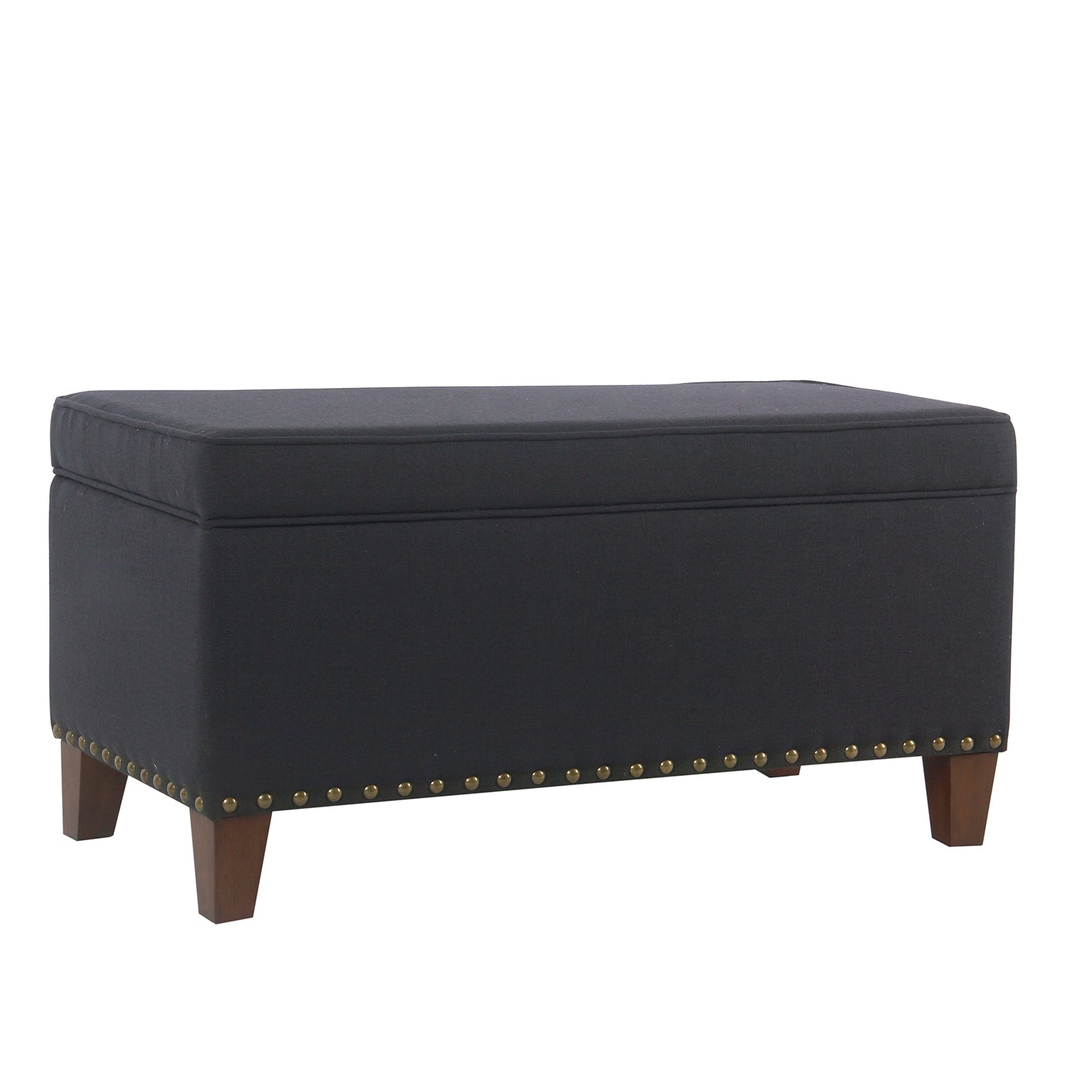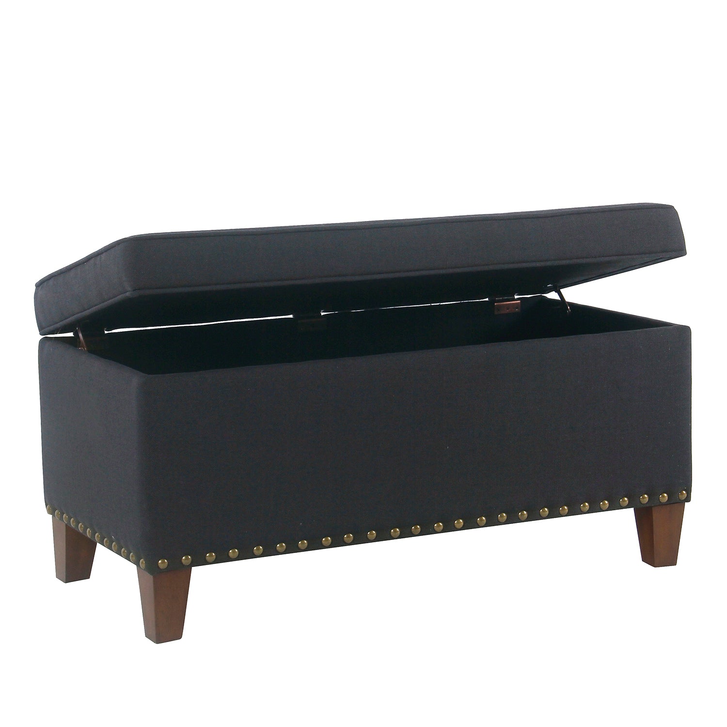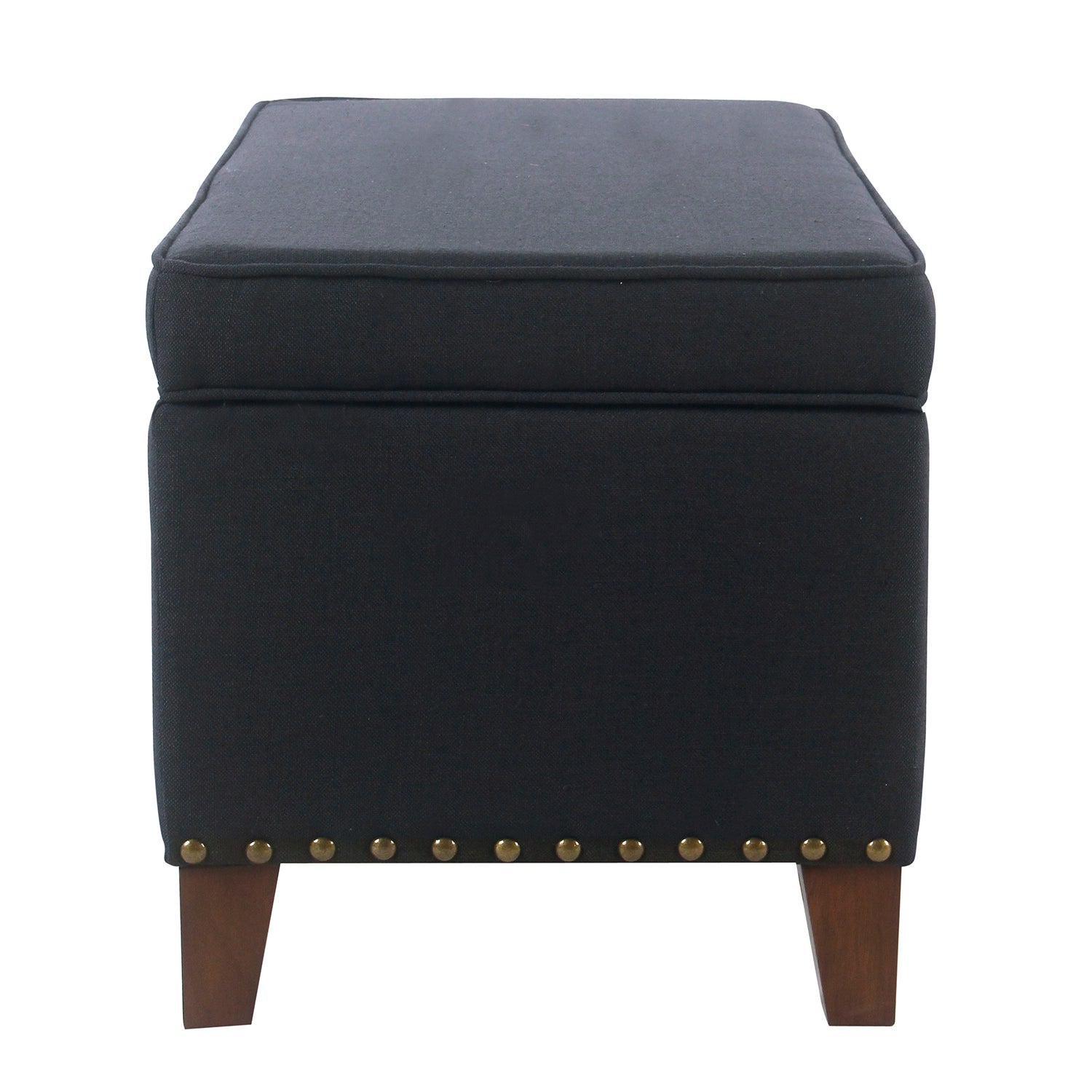 Add a casual touch to your living space with this clean lined bench with hidden storage. It is designed with precision and features navy blue fabric upholstery with welting trims on the seat and contrasting nail head trim details at the bottom. Beneath the seat, there is a hidden lift top storage which offers an organized storage to your blankets, bedspreads, books and other items. It is supported on tapered wooden legs that strengthens its construction while the space underneath can be used for placing shoes.