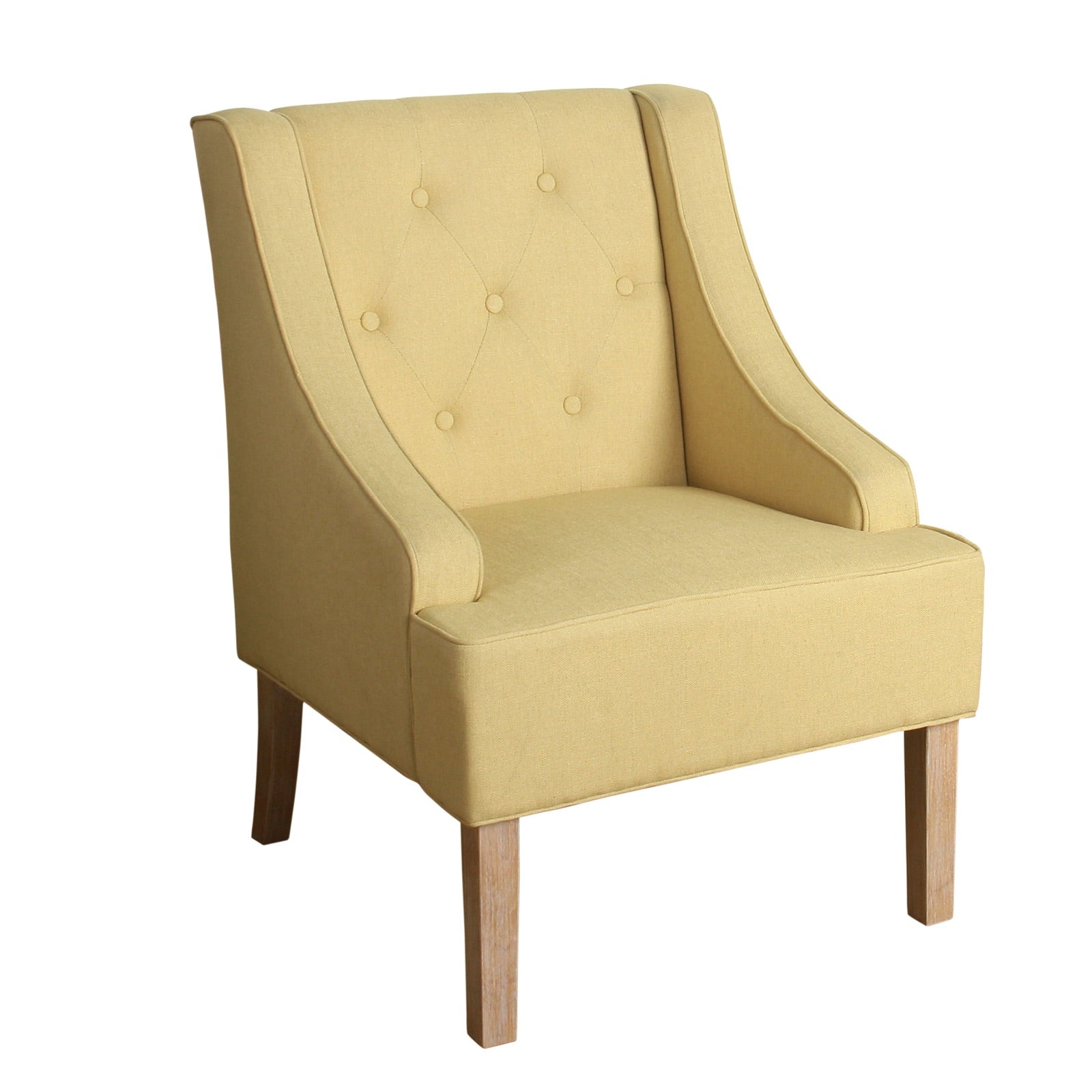 Combining contemporary style with timeless comfort, this mid-century modern Accent Chair will add instant flair to any room of your home. The frame of the chair is constructed from durable wood and it features light yellow fabric upholstery that is easy to blend with a variety of designs. Its button tufted seat back brings depth and texture to your space, while its track arms curve up to create a classic wingback style. Add this chair in your living room to offer guests a cozy seat, or place it in your bedroom as an accent chair.